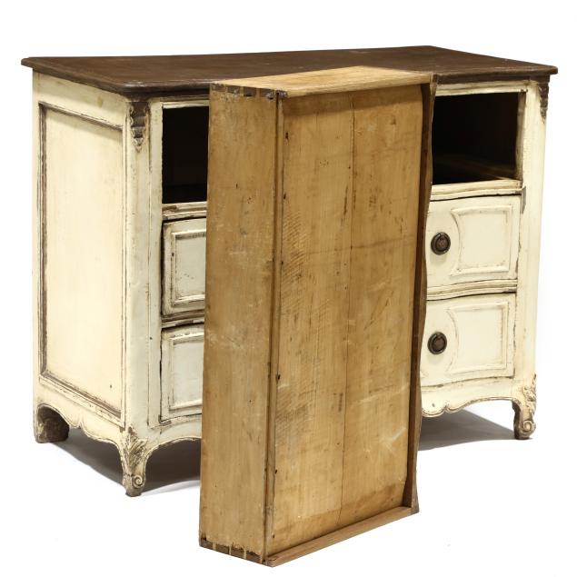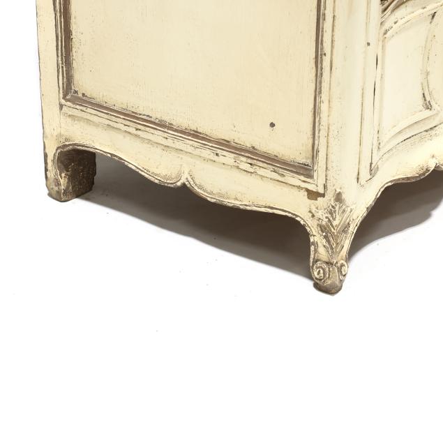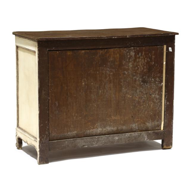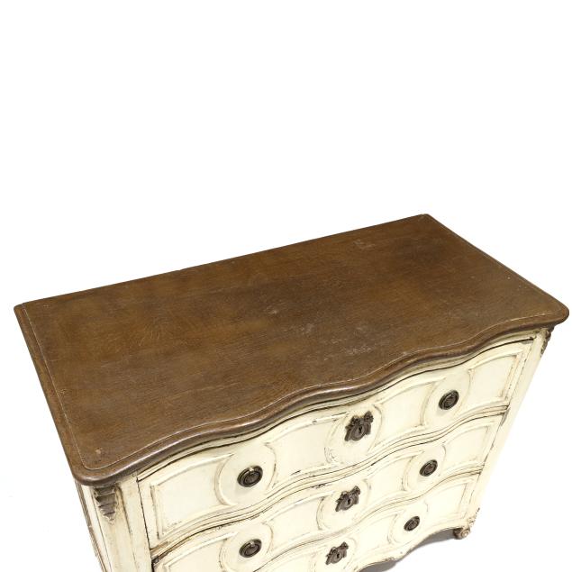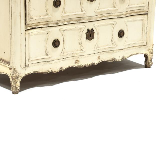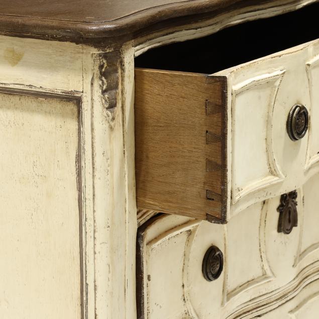 Circa 1900, brown painted serpentine top with molded edge, conforming case in antiqued cream paint with three drawers, rounded stiles with acanthus leaf terminating in whorl feet, paneled sides.