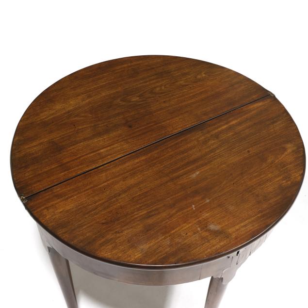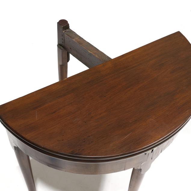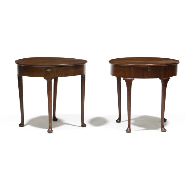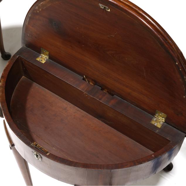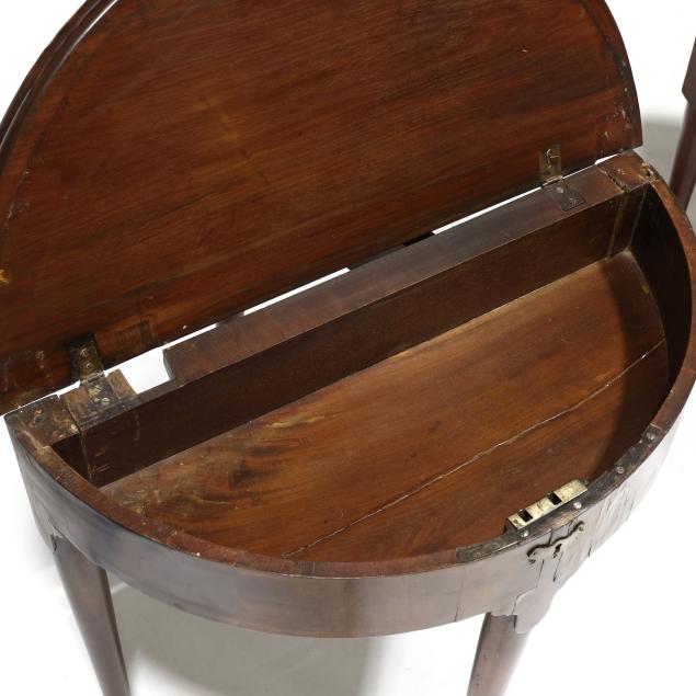 Circa 1800, mahogany, mahogany veneer, deal secondary, demilune form hinged lids, one table with double rear gate-leg supports, the other table with single rear gate-leg support, further hinged lid revealing storage compartment, vertically veneered flush skirt, four straight tapered legs on pad feet.
