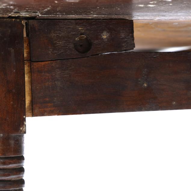 Circa 1840, poplar secondary, rectangular top and drop leaves with slide support, turned legs.