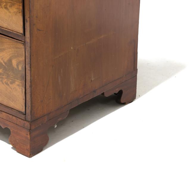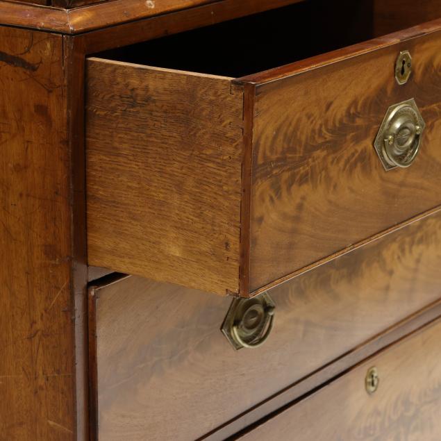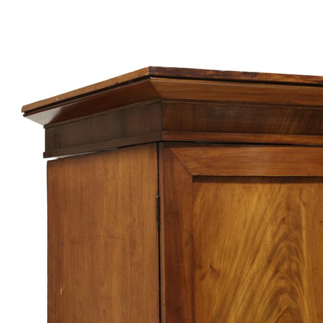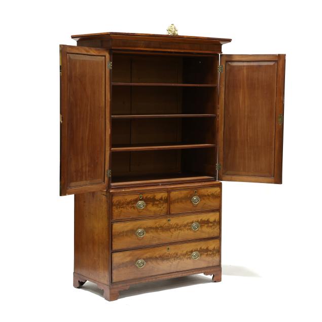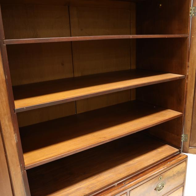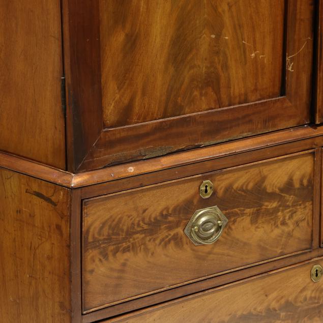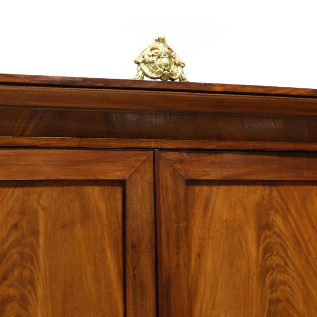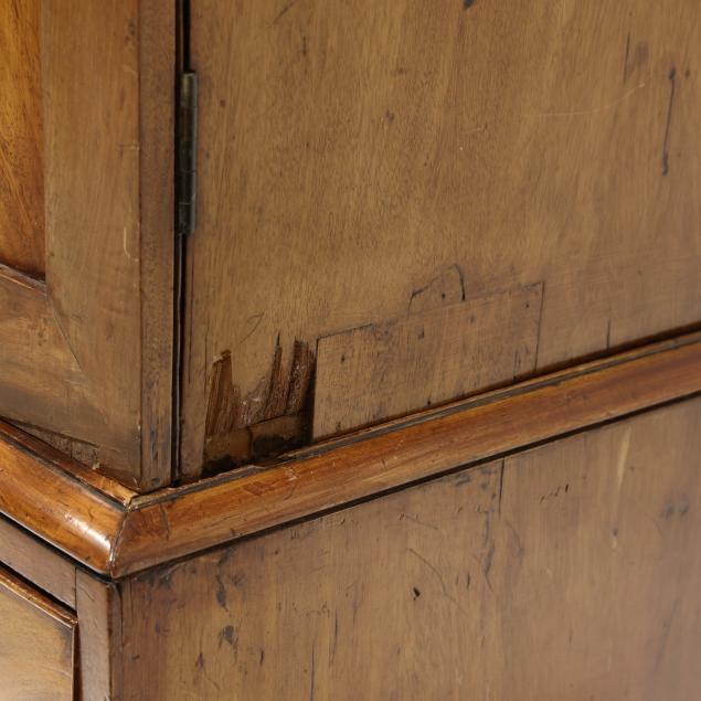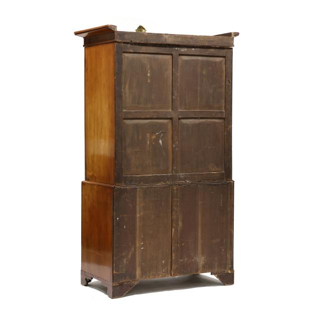 First half 19th century, pine and deal secondary, three part form, flared cornice with central ormolu mount, two hinged paneled doors, shelved interior, the base with two over two cock beaded drawers with burl mahogany veneers, straight bracket foot base.