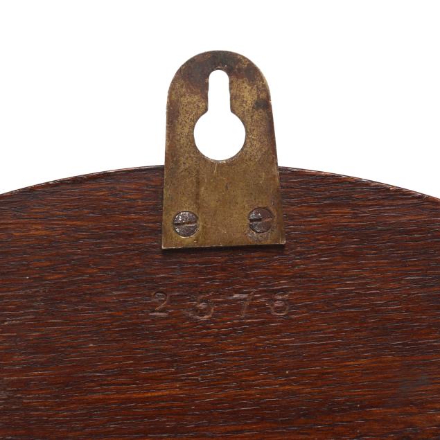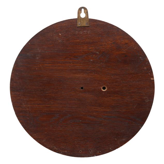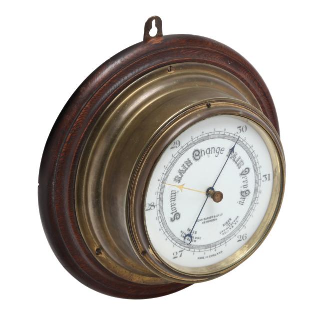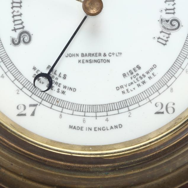London, round white ceramic 6-inch dial signed "JOHN BARKER & Co. LTD. / KENSINGTON," within a brass drum bezel mounted on a conforming walnut plaque, numbered 2576 to the reverse.
