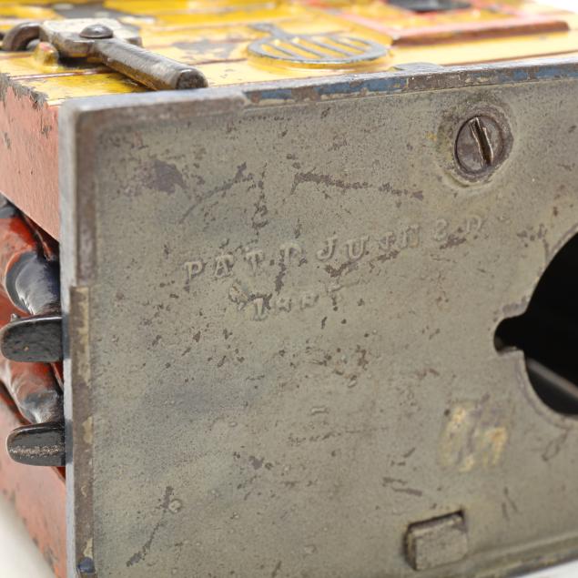Cromwell, Connecticut, patented 1885, designed by Edward L. Morris, painted cast iron, to use bank: place coin on roof above man's head, move broom handle on right side of building back and the man will flip to kick the coin into the bank, underside stamped "PATD JUNE 2 - /1885" and with old auction label affixed.