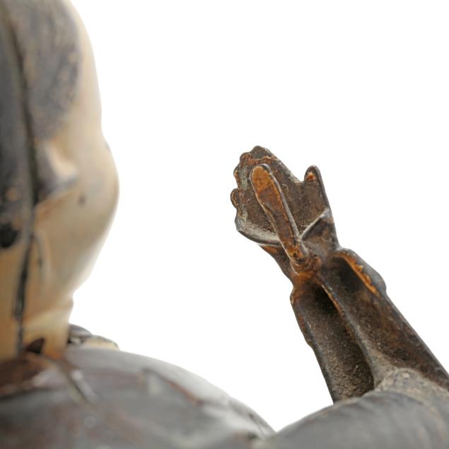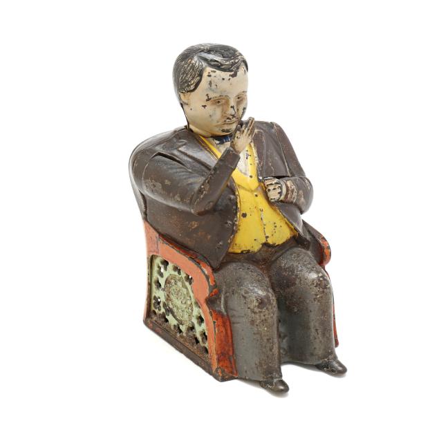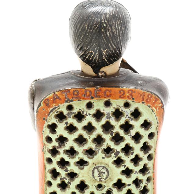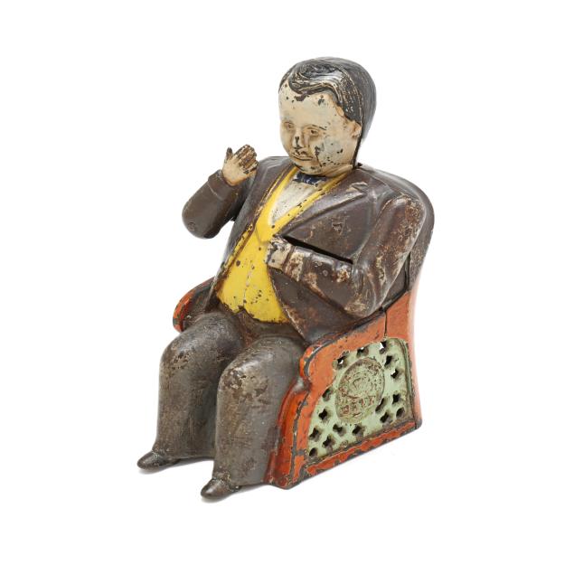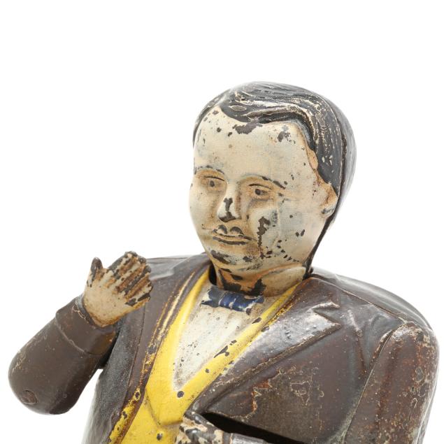 Cromwell, Connecticut, patented 1873, designed by John Hall, painted cast iron, to use bank: place coin in man's right hand to activate the weighted mechanism as the figure pockets the coin and bows his head in a gesture of appreciation, the sides of chair stamped "TAMMANY/BANK" and the chair back stamped "PATd DEC 23 1873".