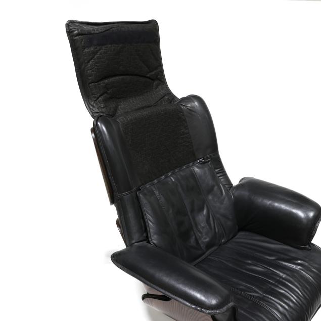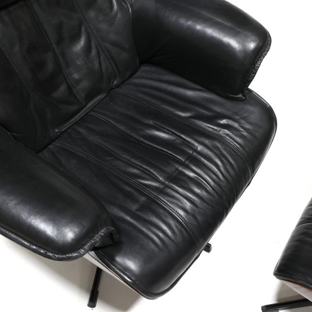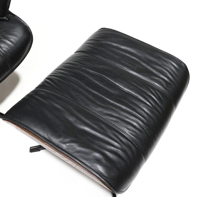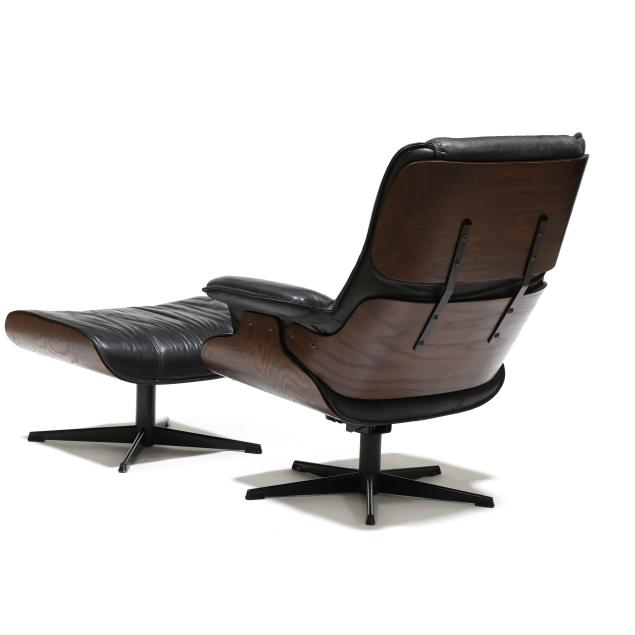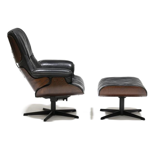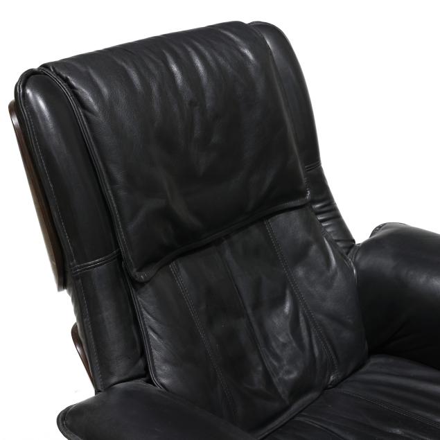 Circa 1980, Canada, black leather, oak bentwood frame with black painted metal legs, swivel seat chair with slight tilt, stationary ottoman.