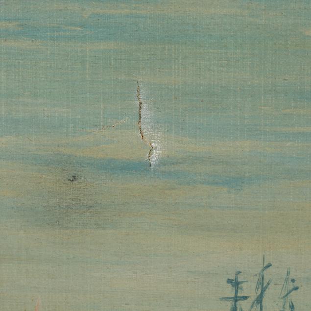 Two inch tear at left side, some buckling to canvas at the corners, a few areas of repair with retouch.