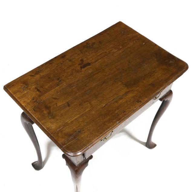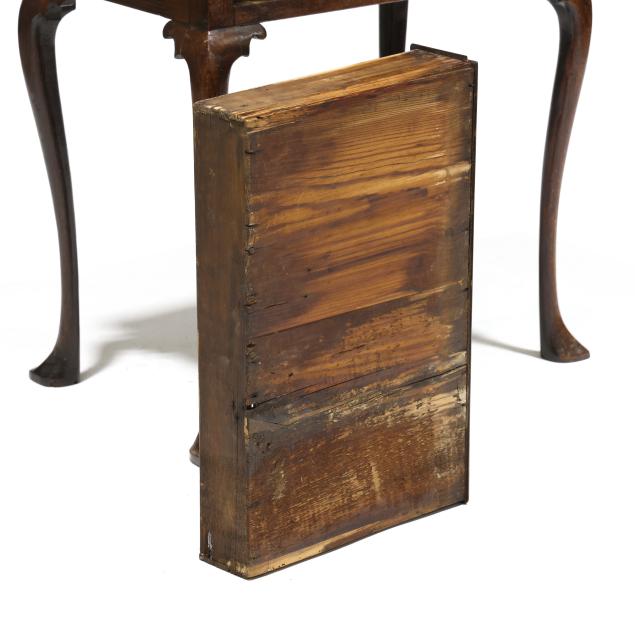 From the Collection of a Lady, Williamsburg, Virginia Top reset; top with old scratches, wear and dark staining; old but later pulls covering center hole; some minor edge loss to drawer.