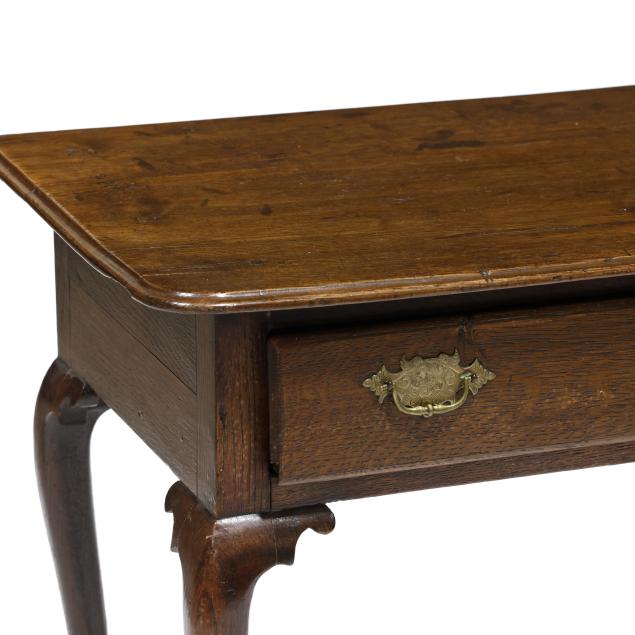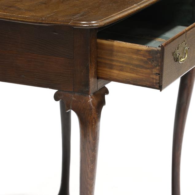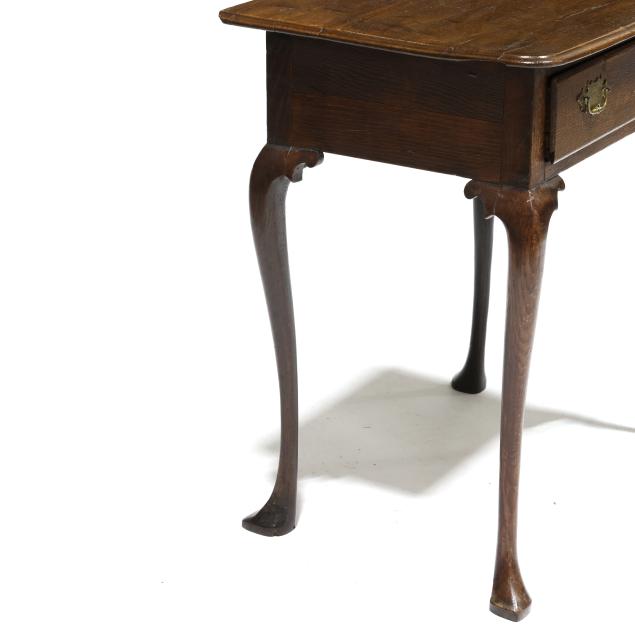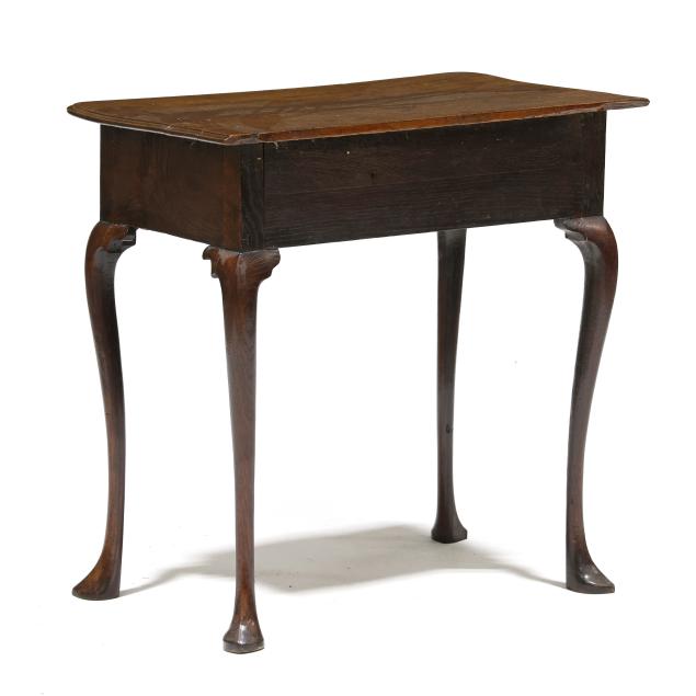 Late 18th century, pine secondary, rectangular top with molded edge, single lipped drawer, cabriole legs with shaped return, snake feet.