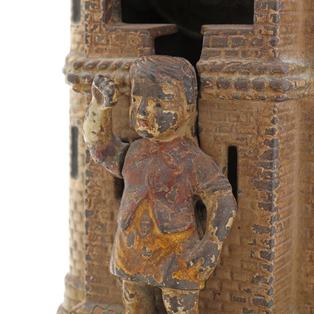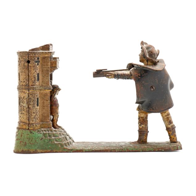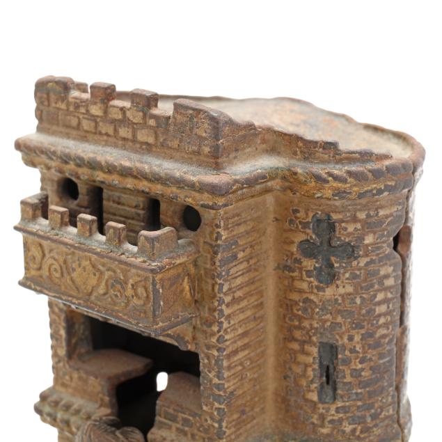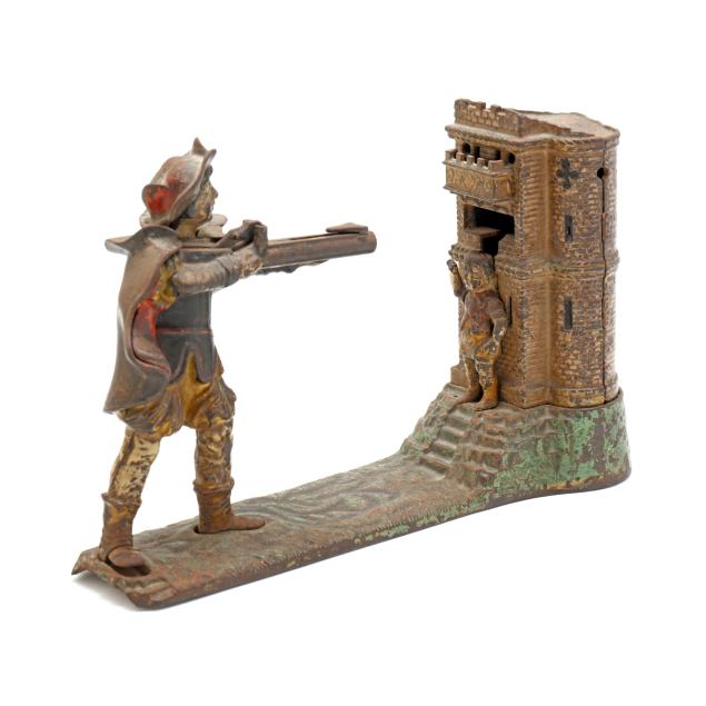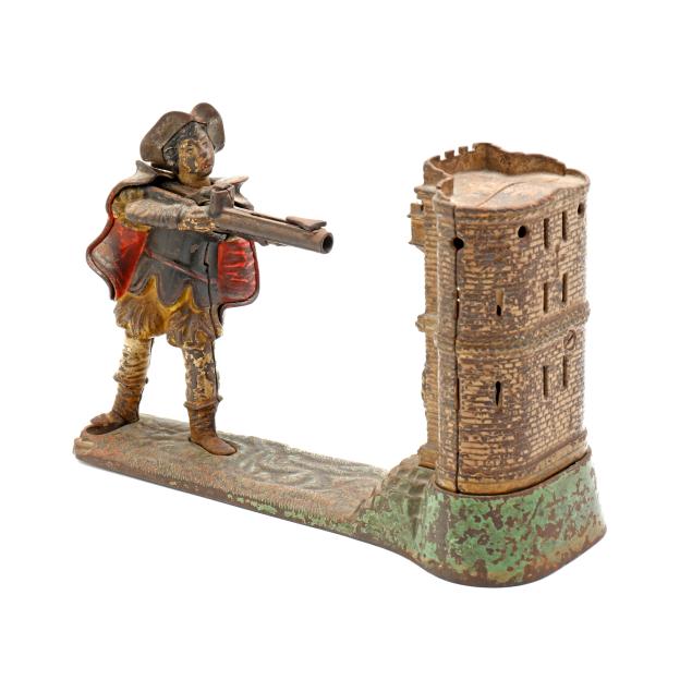 Cromwell, Connecticut, painted cast iron, stamped "PATENTED JUNE 28 1896" to underside, to use bank: pull back lever on Tell's rifle, place the coin on top of the rifle and lower the boy's hand to reveal the apple, press down Tell's right foot and the coin fill fly into the castle, hit the apple off of the boy's head and fall into the bank with a sonorous chime.