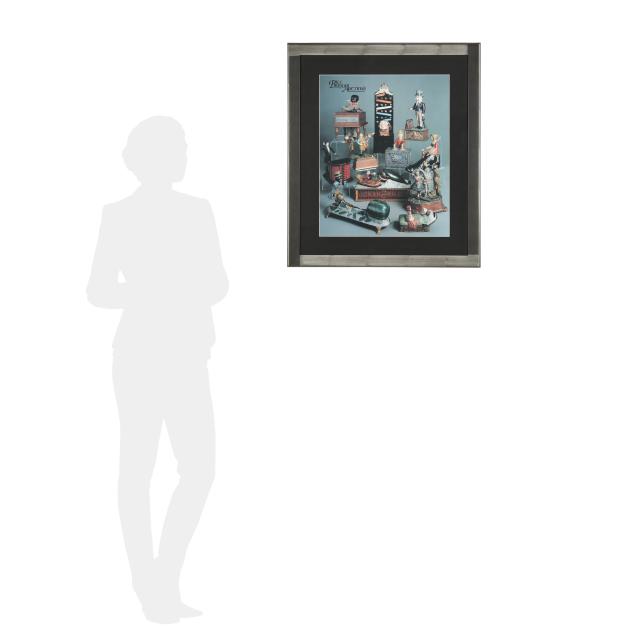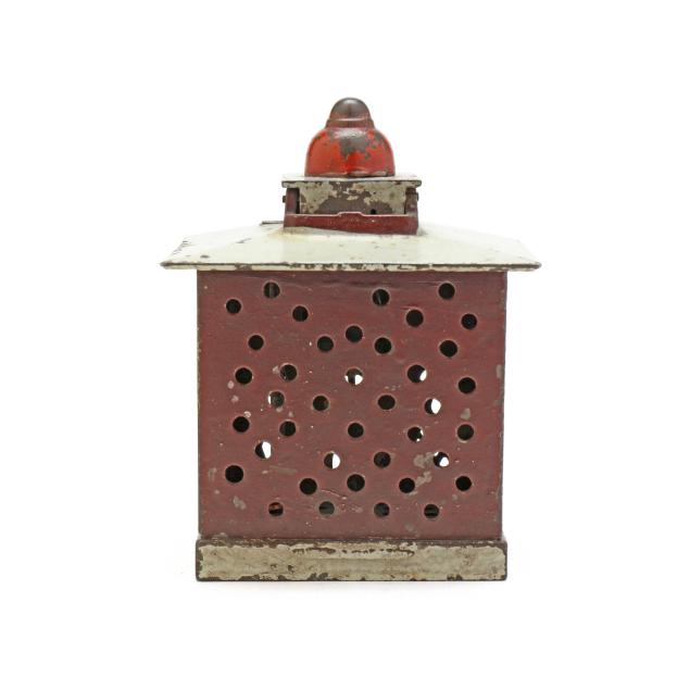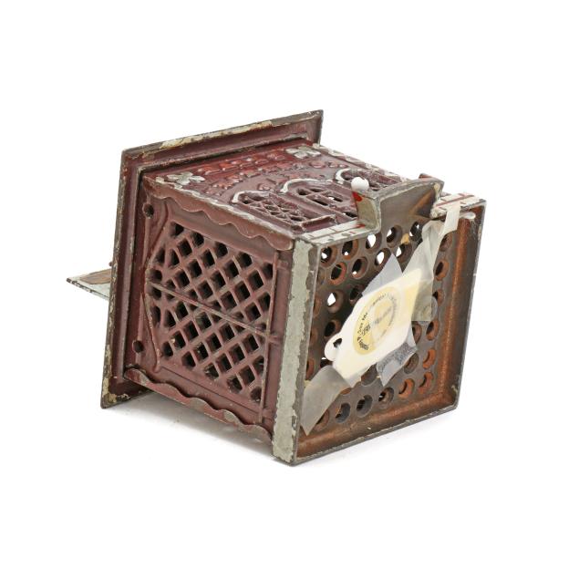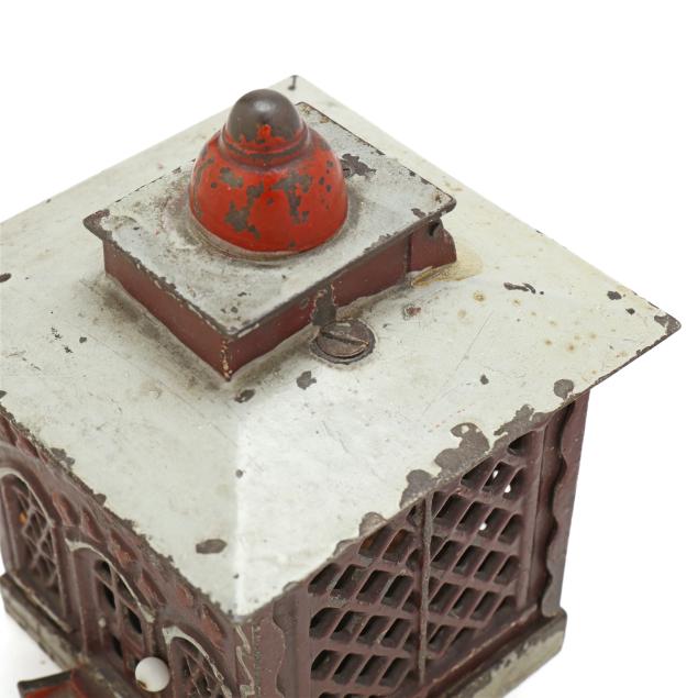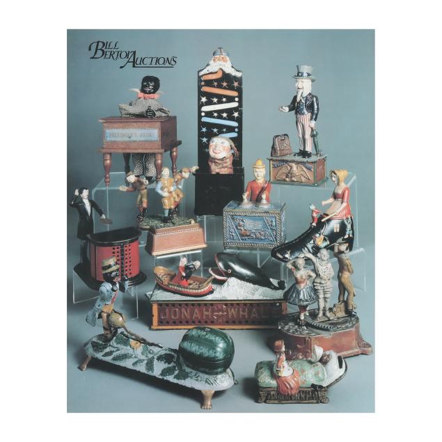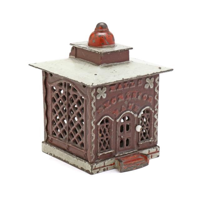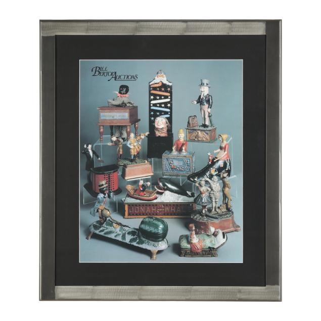 Cromwell, Connecticut, patented December 21, 1869, designed by John D. Hall, painted cast iron, to use bank: pull the knob by the door of the bank and a painted wooden cashier will appear at the top, place a coin on their desk and they will deposit the coin into the bank and disappear, auction label affixed to underside (5 1/2 x 4 x 4 in.). This lot includes a framed photographic poster in colors of vintage coin banks from Bill Bertoia Auctions, framed below glass (Frame dimensions 29 1/2 x 25 in.).