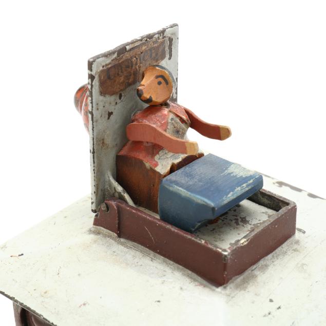 Mechanism working at time of evaluation; break and repair with possible later arms to cashier, possible later desk; old paint surface with small losses and rust spotting.