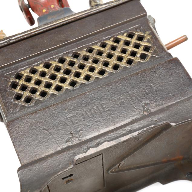 From a Prominent Collector, Aiken, South Carolina Mechanism partially operation at time of evaluation, monkey's hat will catch on its head; old paint with areas of loss and dust spotting.
