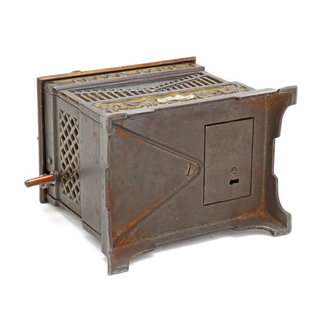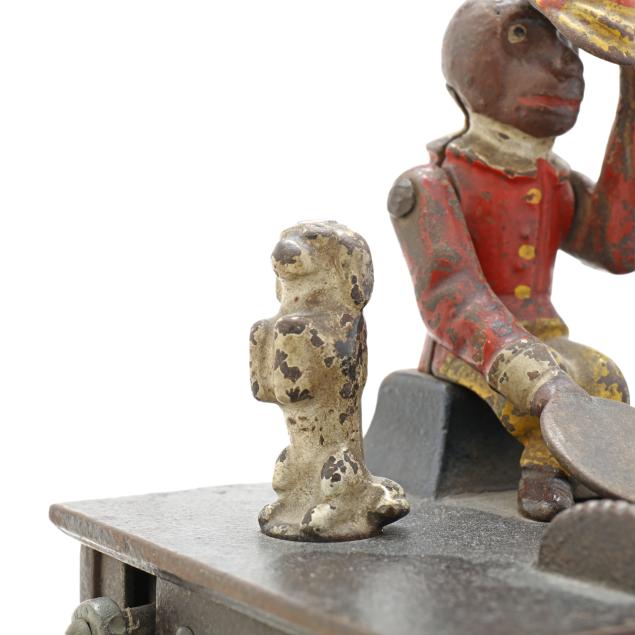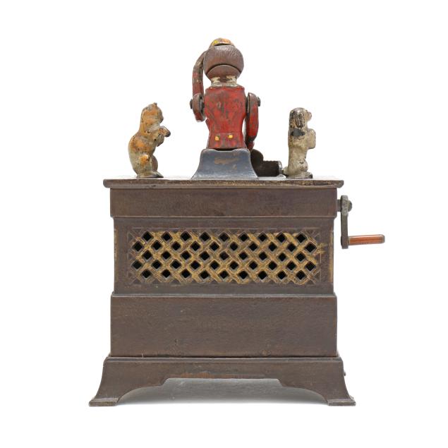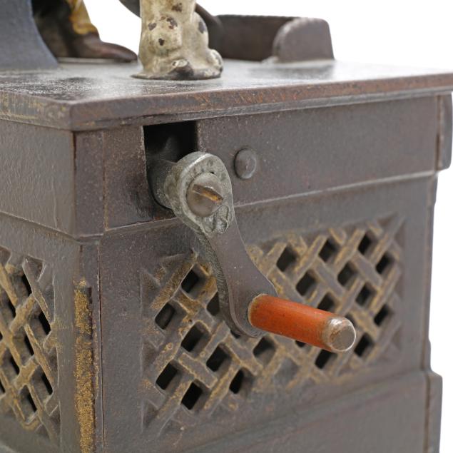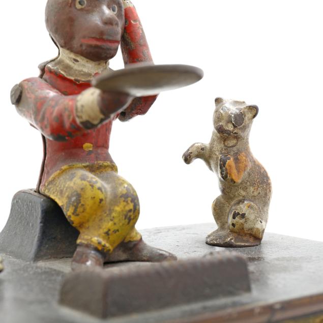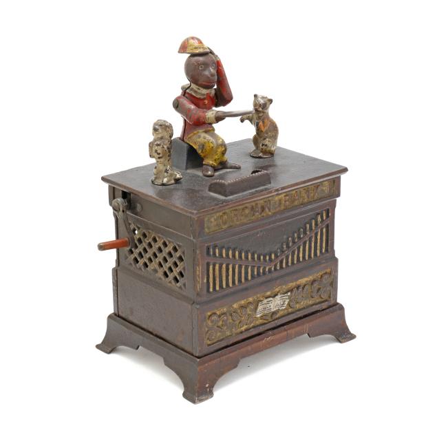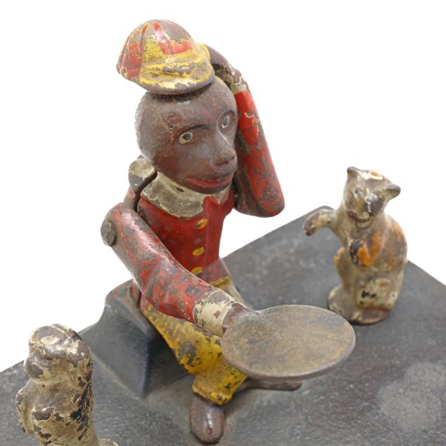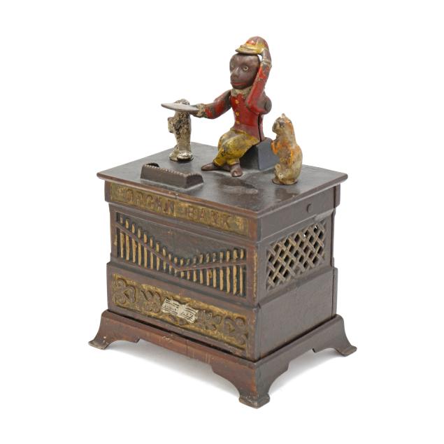 Frankfort, Pennsylvania, designed by Louis Kyser and Alfred C. Rex, patented 1882, painted cast iron, to use bank: place coin on monkey's tray, turn the crank clockwise to activate spinning dog and cat, the monkey will tip its hat and deposit the coin in the organ bank, all the while a chime tune will play, stamped with partially visible patent date to posterior.