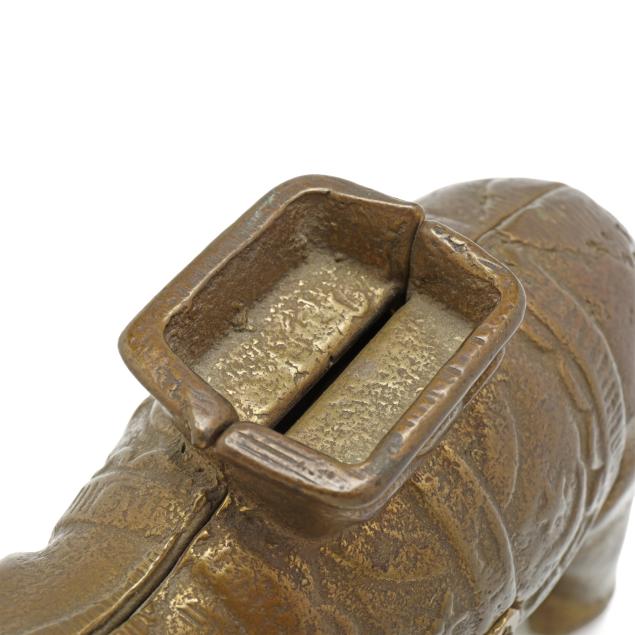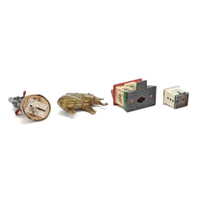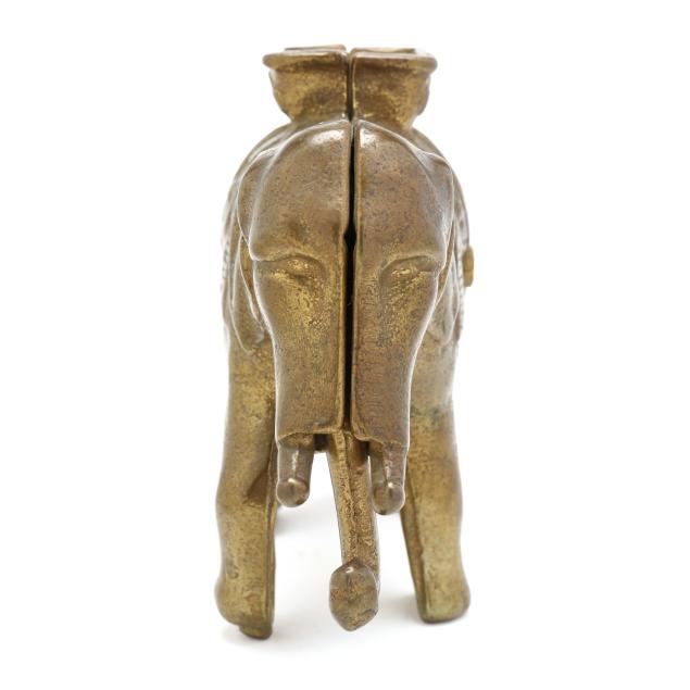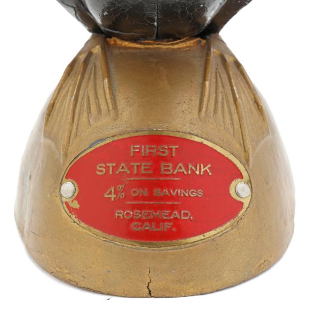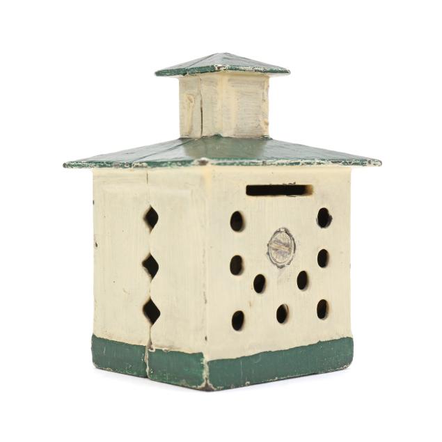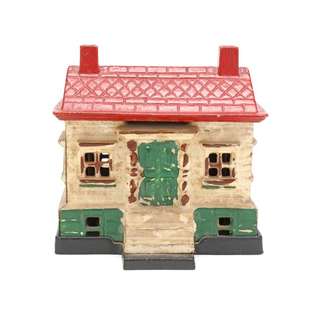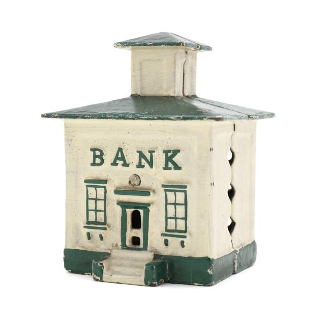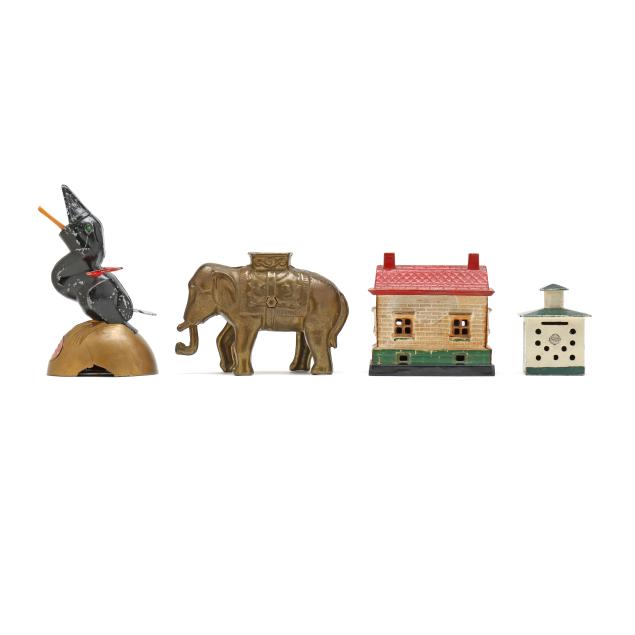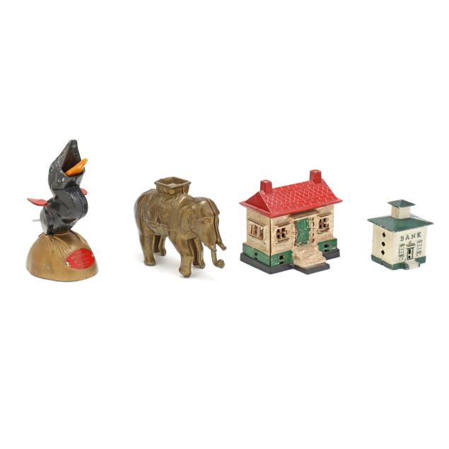 20th century, (4) banks including a painted cast iron J & E Stevens Co. Style Cupola bank (3 5/8 x 2 3/4 x 2 1/4 in.); a painted cast iron Ohio Foundry Co. reproduction bank of a house with a basement, stamped to underside and with original patent date of 1893 (4 5/8 x 4 5/8 x 4 in.); a cast brass semi-mechanical A.C. Williams elephant coin bank with swinging trunk (4 1/2 x 6 x 2 1/4 in.); and a mechanical painted metal baby bird bank, with plaque to base reading "FIRST / STATE BANK / 4% on savings / Rosemead, / Calif.", with company and patent mark to underside (7 1/4 x 3 1/2 x 4 1/4 in.).