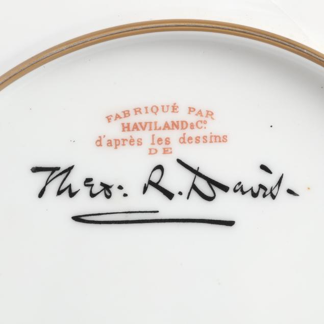 Produced in France, 1880s, hand-painted and gilt porcelain plate, depicting a ruffled grouse in its habitat, signed "D" after original designs by Theodore R. Davis (American, 1840-1894), the underside marked with blue design patent mark "August 10, 1880 / No. 11936", presidential eagle to underside of border, and green Haviland monogram and red printed factory mark.