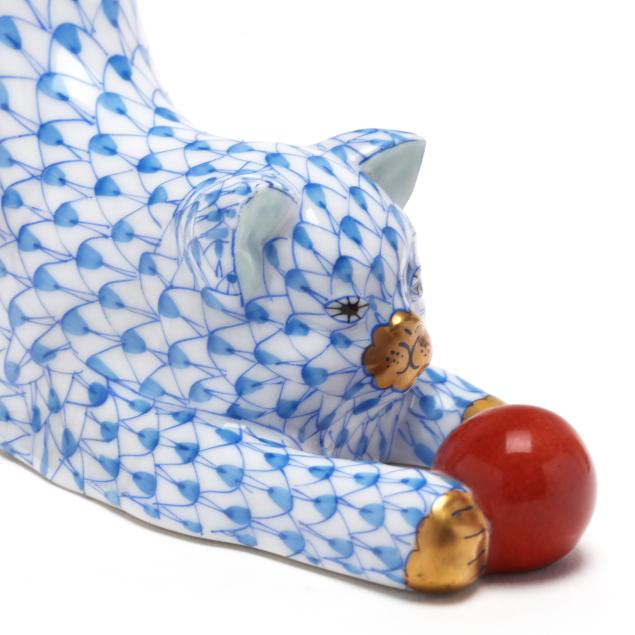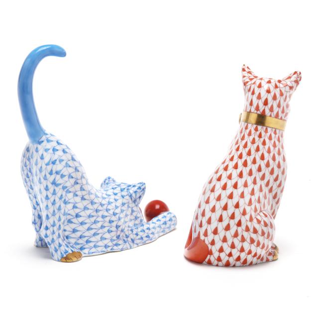 Hungary, hand-painted and gilt porcelain, the first a #15319 rust fishnet cat with bow; the second a #15309 blue fishnet cat with ball, both marked with company backstamp to underside.