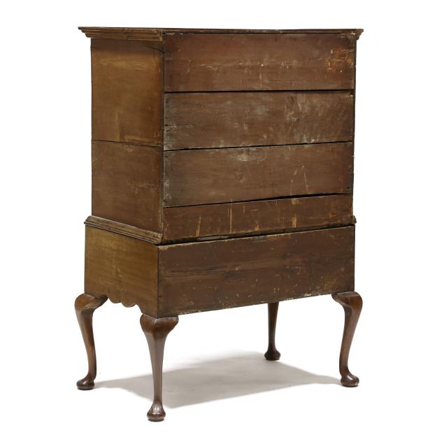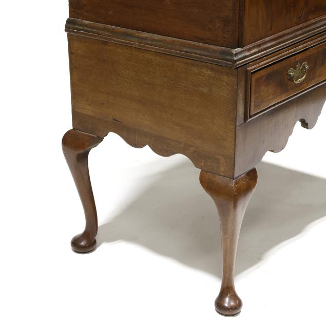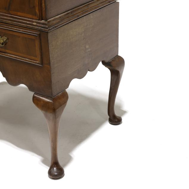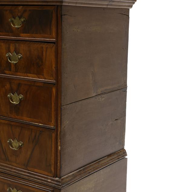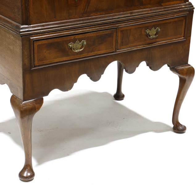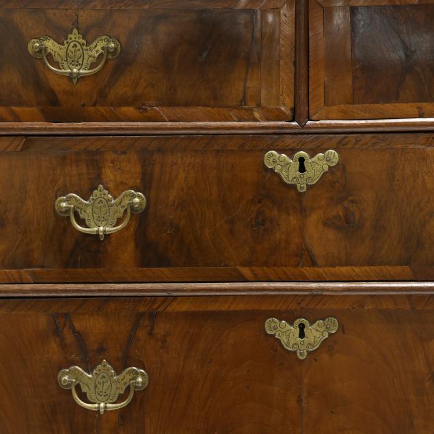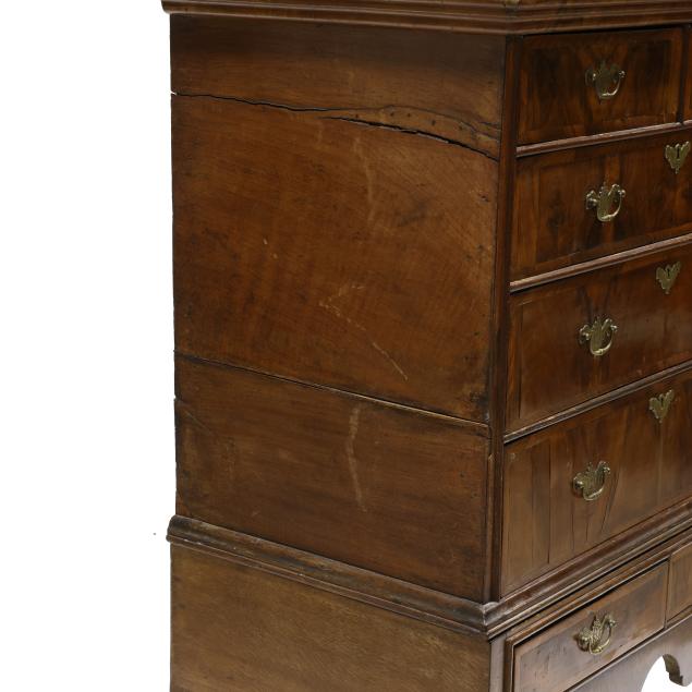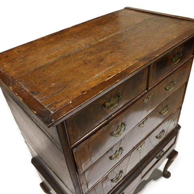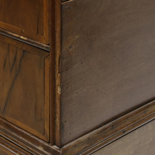 18th century, two part form, walnut and elm veneers, oak and pine secondary, finished top with applied molded edge, the upper case with two over three drawers, the base with two small drawers all having burl wood veneers and banded inlays, scalloped skirt, slight cabriole legs with pad feet.