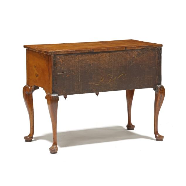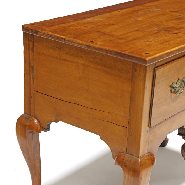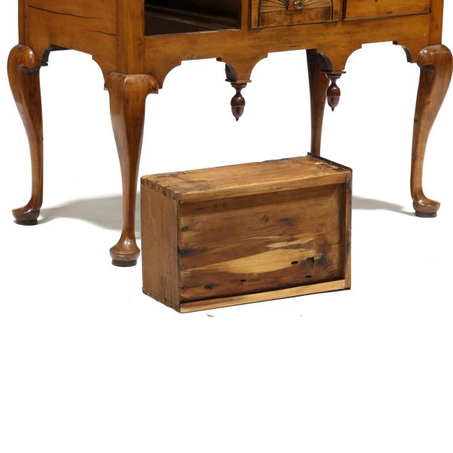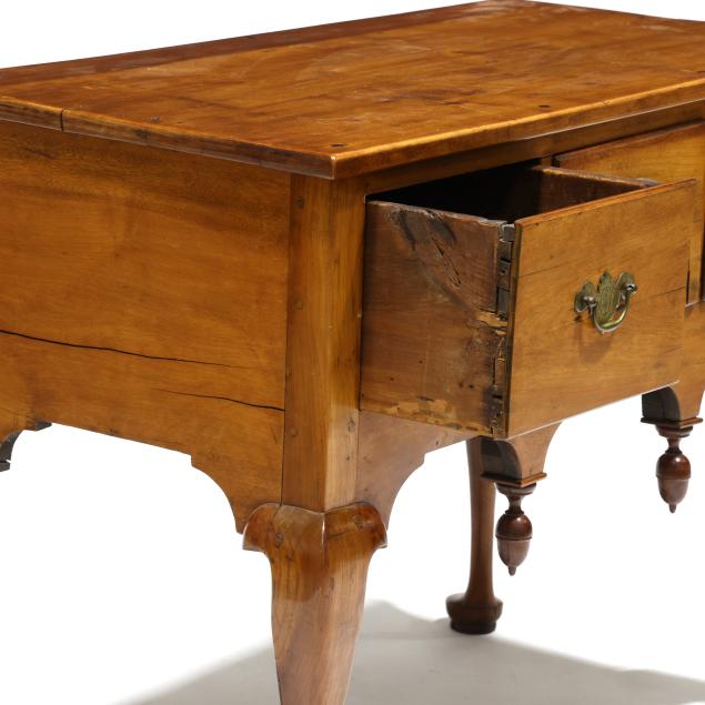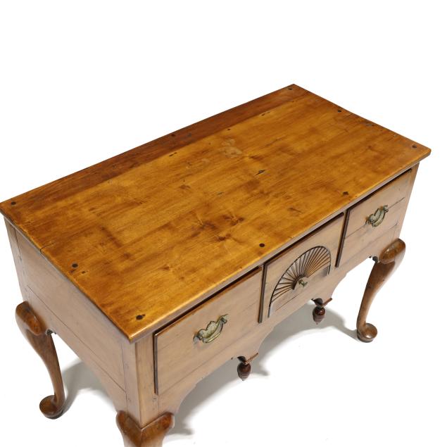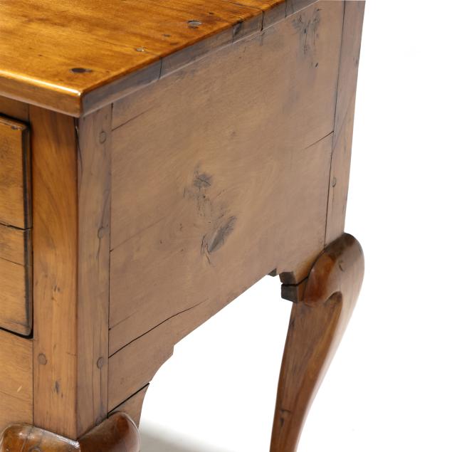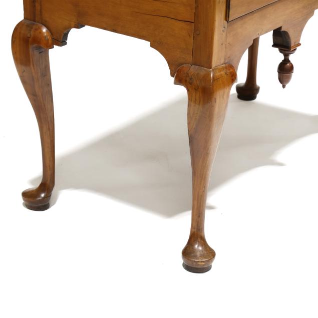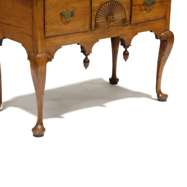 Circa 1770, white pine secondary, rectangular top, three lipped drawers featuring shell carved panel to the center, scalloped skirt with acorn drop finials, cabriole legs with pad feet.