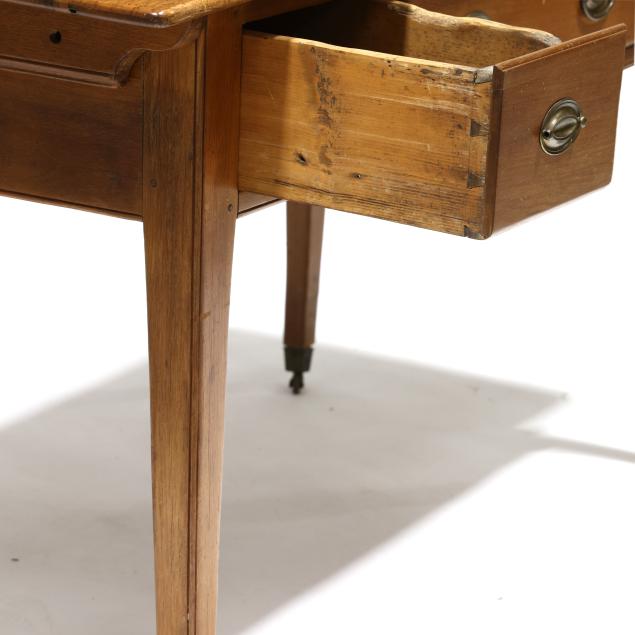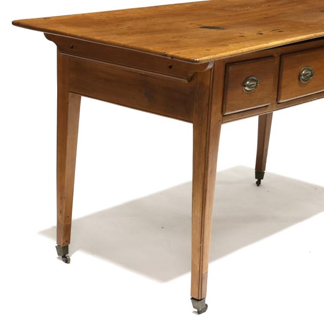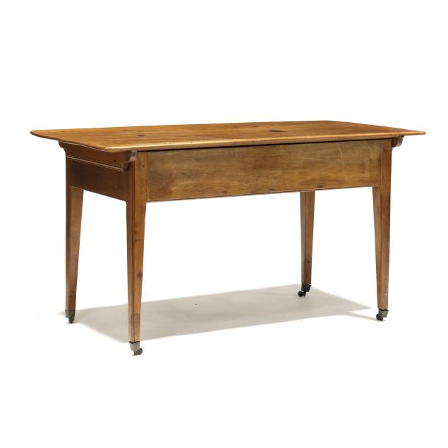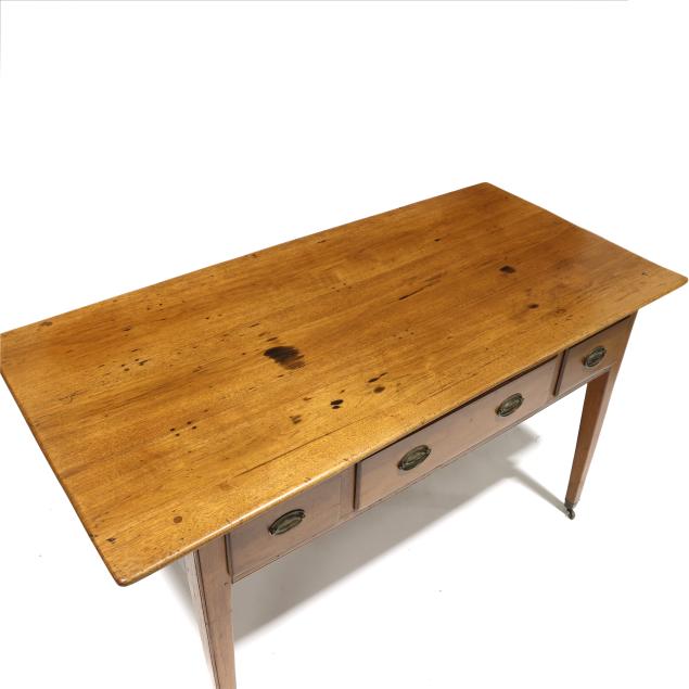 Early 19th century, poplar and yellow pine secondary, rectangular three board top with overhang, three lipped drawers, straight tapered legs with scratch bead corner, on casters.