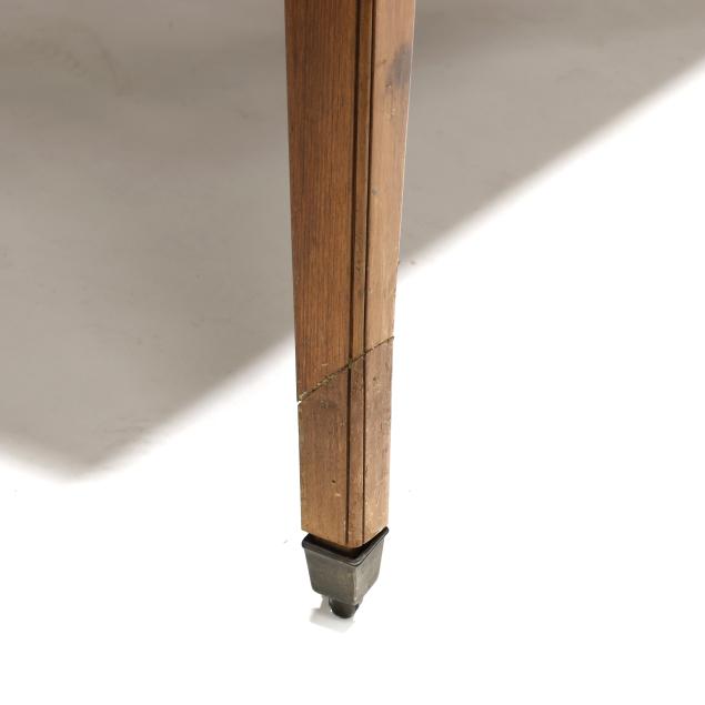 Top reset; old dark staining and wear to top; later brasses (in original holes); all four legs tipped the lower three inches.