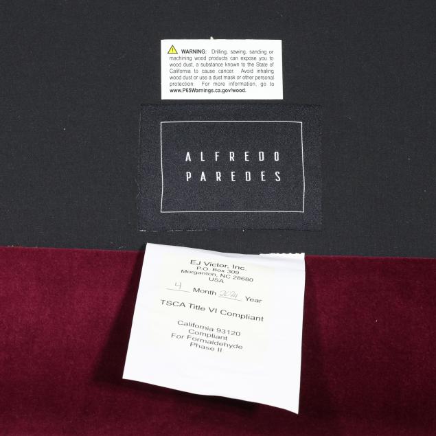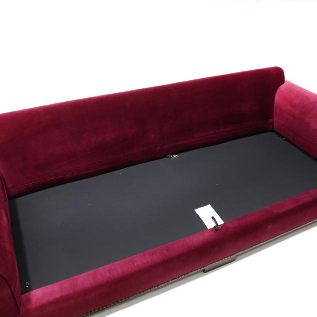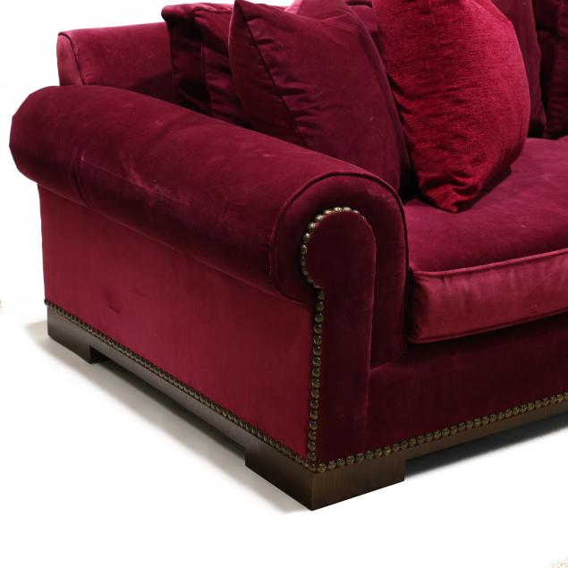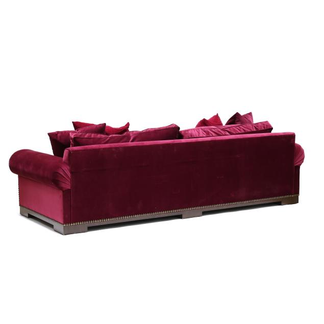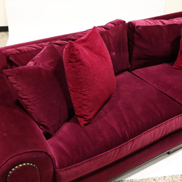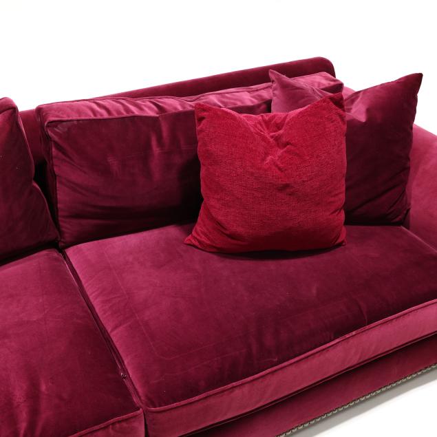Contemporary, luxurious purple velvet upholstery, down filled cushions with four throw pillows, bronze tone tack trim, ebonized large block feet, labeled.