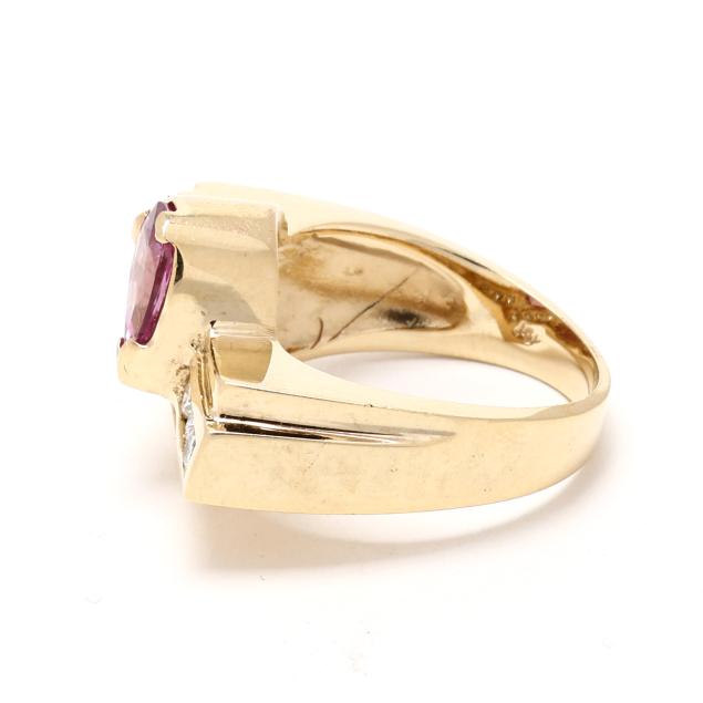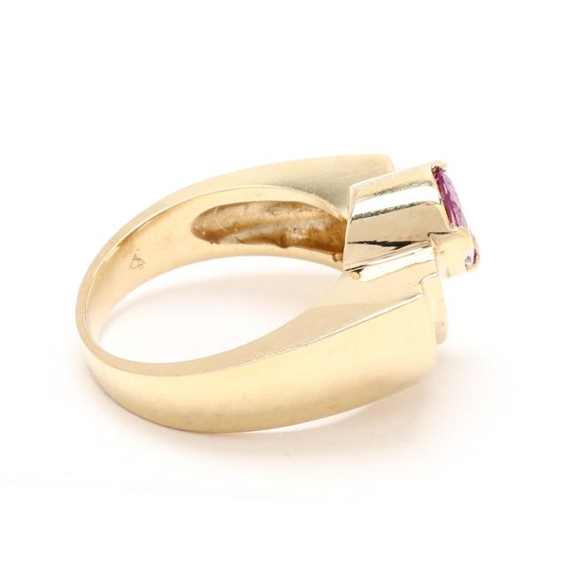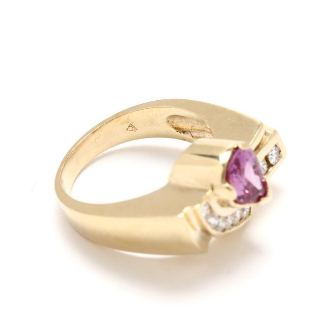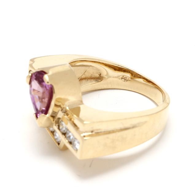 Fan motif ring with collet set pear cut pink sapphire (8.0 x 6.0mm) weighing approximately 1.40 carats, and channel set with full cut round diamonds weighing approximately .34 total carats (H-I color, SI2-I1 clarity), on a tapering shank, stamped 14K.