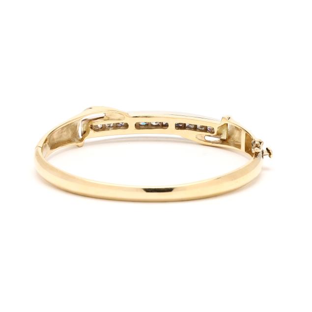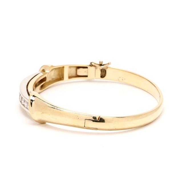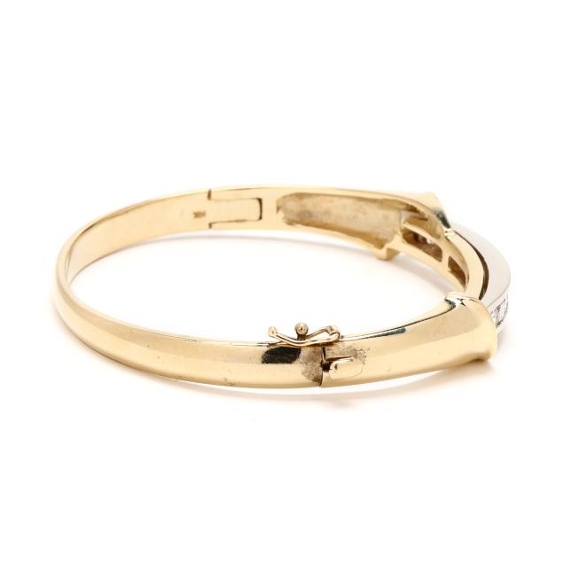 The hinged bangle in the design of two opposing calla lilies with white gold central channel set with full cut round diamonds weighing approximately 1.90 total carats (H-I color, SI1-SI2 clarity), completed with an integrated box clasp and figure eight safety, stamped 14K.