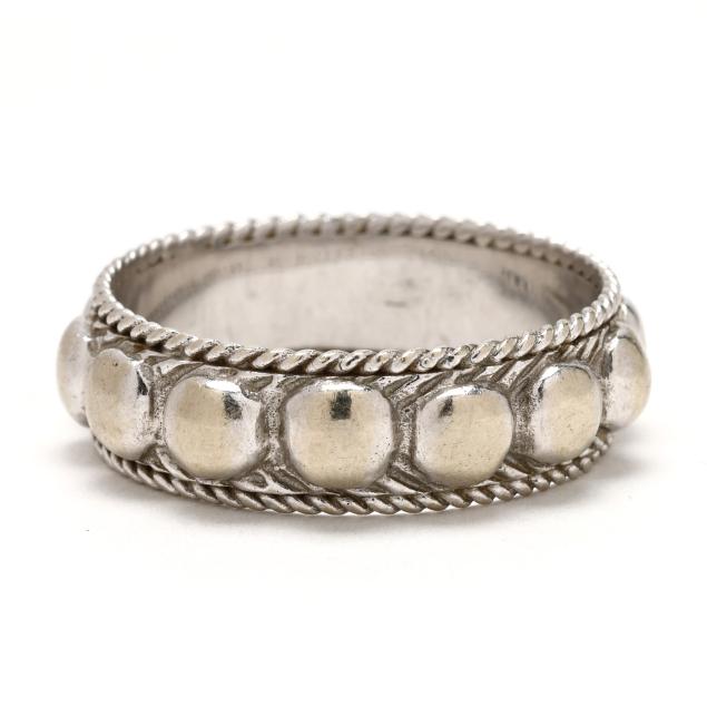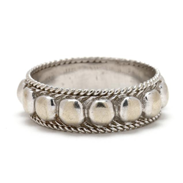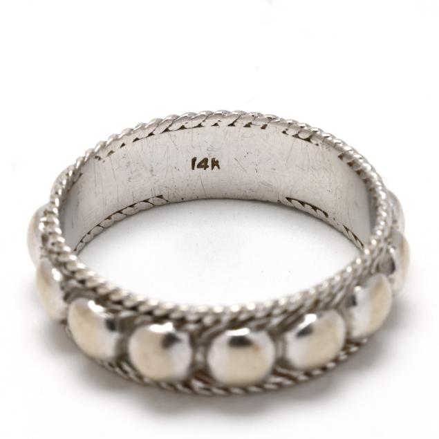 The raised beaded motif band with rope twist broder, stamped 14K.