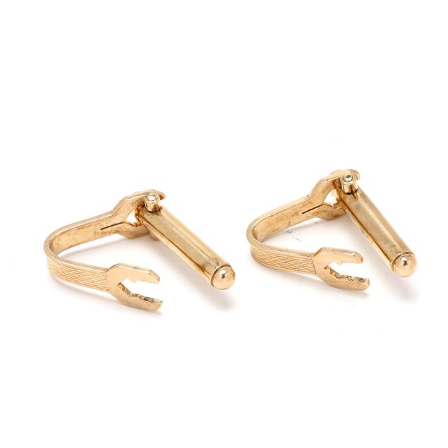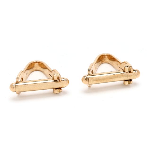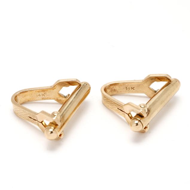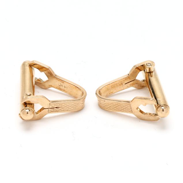 Stirrup design with wave machine engraving, completed with a hinge, stamped 14K.