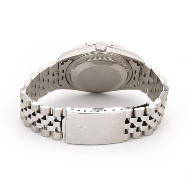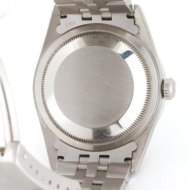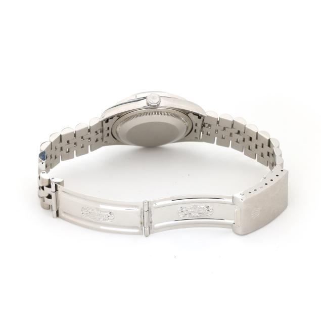 Circa 2000, automatic, Rolex 3135, reference number 16234, serial number P640661, the stainless steel Oyster case with white gold bezel set with full cut round diamonds weighing approximately .72 total carat (H-I color, SI1-SI2 clarity) and baguette cut sapphires, bezel testing 18KT, the signed teal gradient dial with single cut diamond hour markers, white gold baton hands, and date window at 3:00 hour, the stainless steel Jubilee bracelet with end caps numbered 555 B, completed with a signed deployant clasp numbered AB4 / 62510 H.