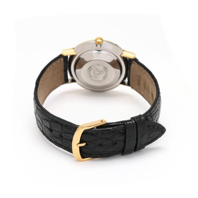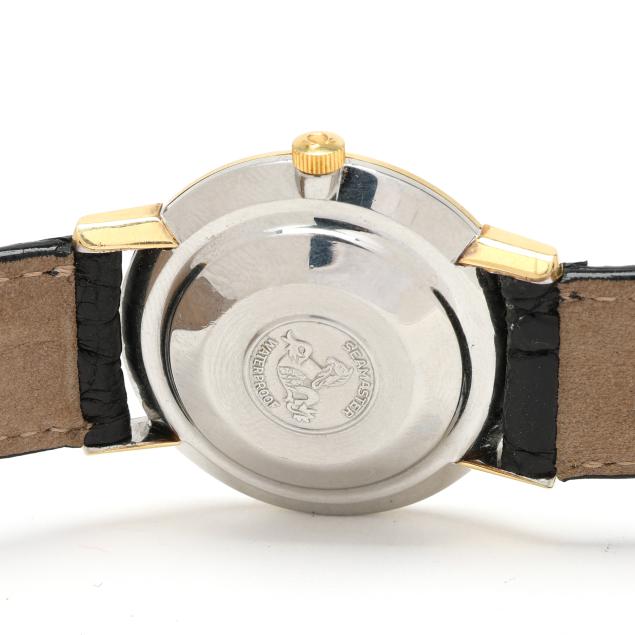 Automatic, Omega 671, reference number 165.004, serial number 22943352, the round stainless steel case with polished gold bezel and gold-capped lugs, the signed silver-tone dial with gold-tone baton hour markers and gold-tone stick hands, the black crocodile strap completed with gold-tone buckle, the caseback with Seamaster logo, gold bezel testing 14KT.