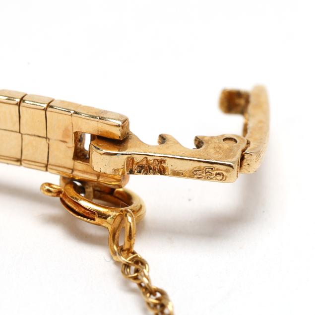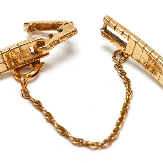 Manual wind, AS 1677, reference number 38157, serial number 2281(?)1, the navette-shaped gold case set with faceted yellowish orange sapphire crystal and with Swiss hallmark for 14KT, the signed gold-tone dial with stick hour markers and blued steel stick hands, the gold integrated bracelet with sunburst detailing completed with a fold-over clasp stamped 14K and safety chain, the caseback numbered.