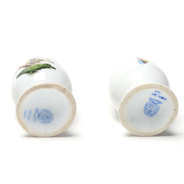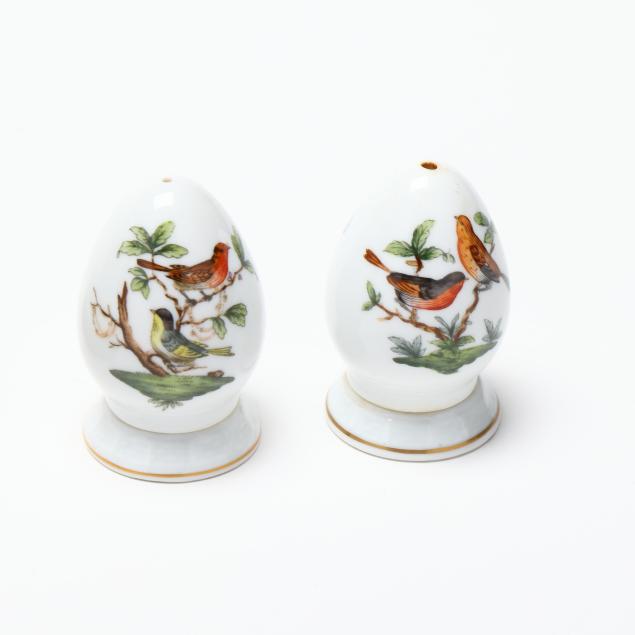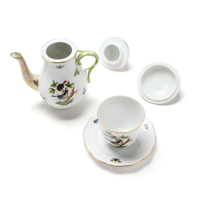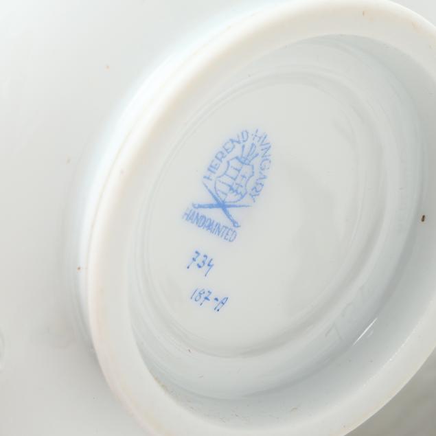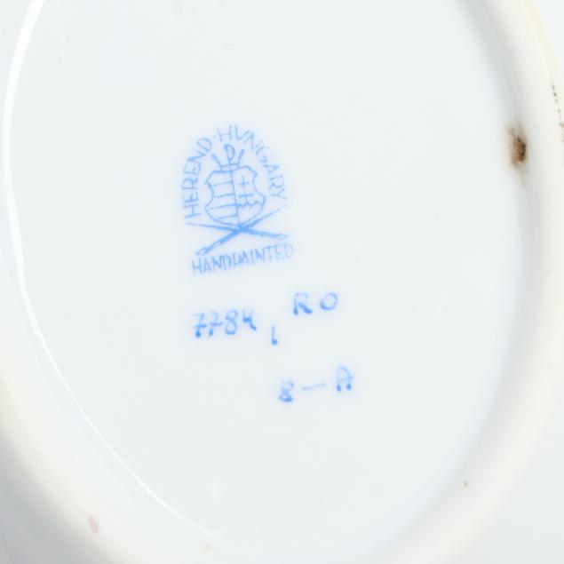 (30) pieces, Hungary, hand-painted, with gilt rims and decorated with birds and insects, to include: a coffee pot with lid #1613 (6 5/8 in.); (12) footed cups with saucers #734; a jam/jelly with lid #372 (4 in.); (2) oval ashtrays #7784 (4 3/8 in.); and a salt & pepper set #260/250; marked to undersides (stamps vary).