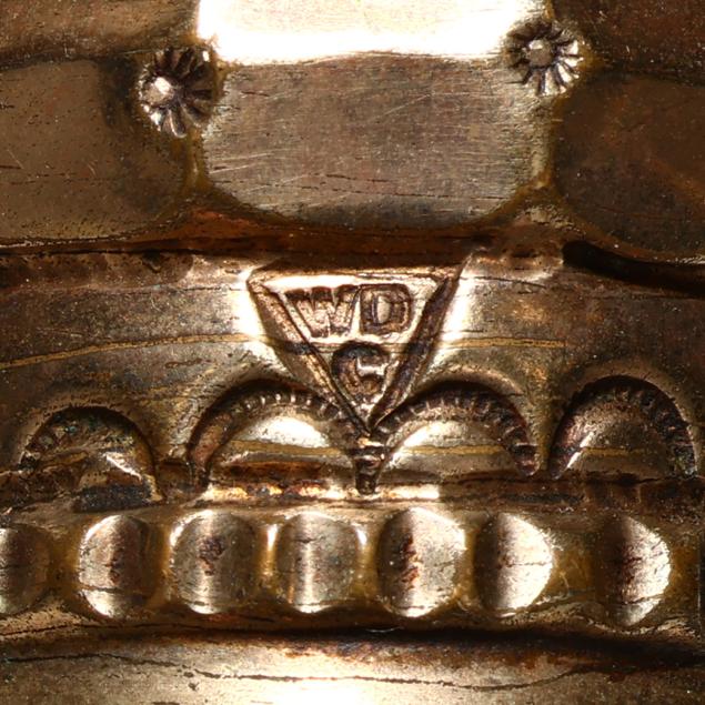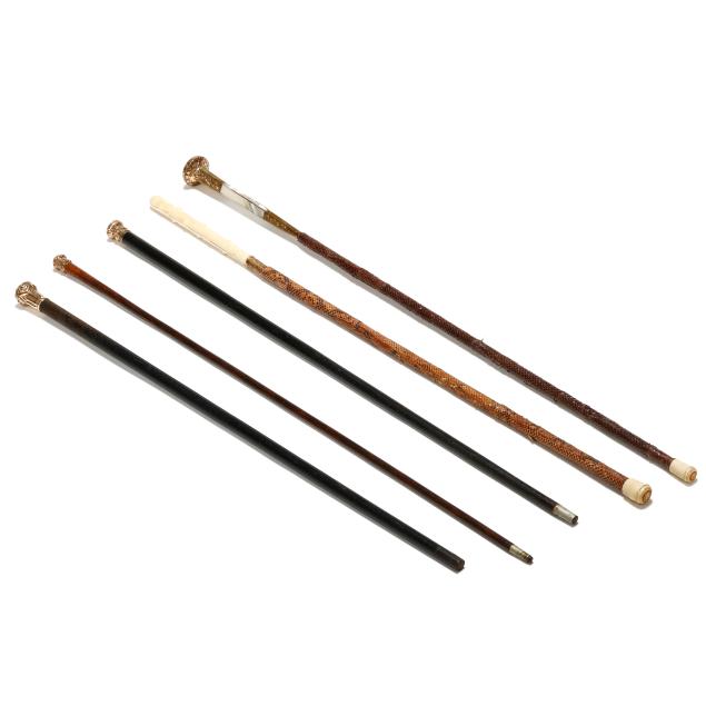 To include two with shafts wrapped in snakeskin with engraved monograms, the shorter with carved bone handle over a gold-filled ferrule; the longer with long gold-plated handle with mother of pearl mounts, engraved monogram to the top and maker's mark E. C. Co.; the last three with chased gold-filled knob handles, the largest handle marked "[cross shape] 2/ 431" and monogram to upper handle, the second with maker's mark of WD/C possibly for Whiting Davis Co., and the third with smallest handle is unmarked.