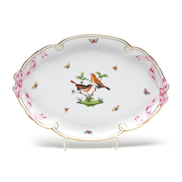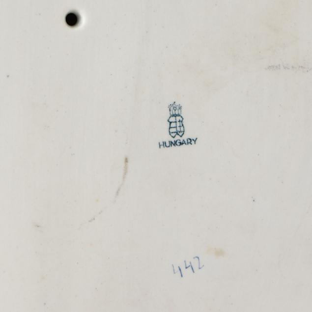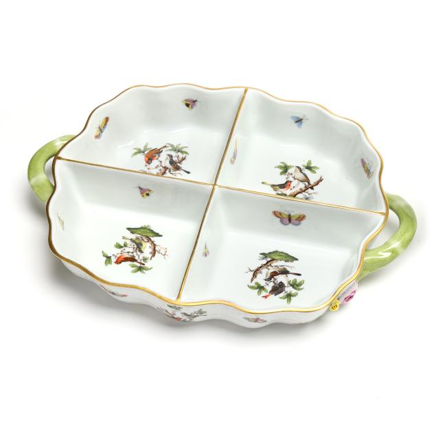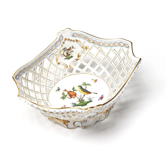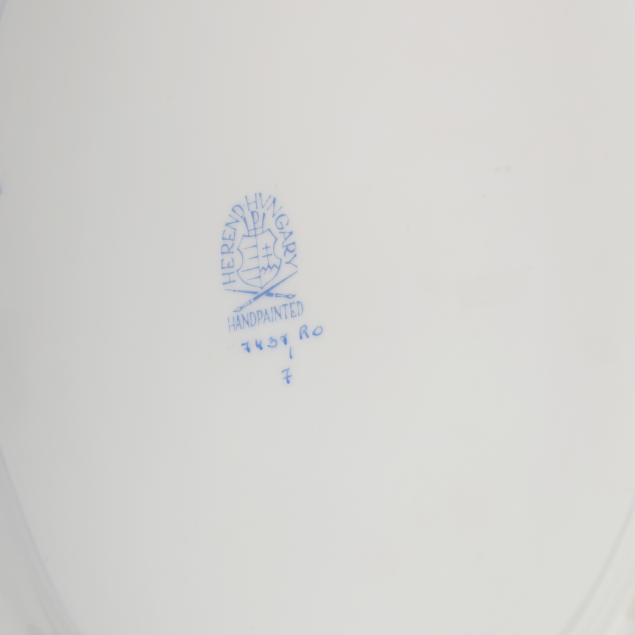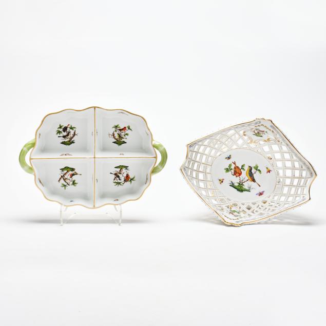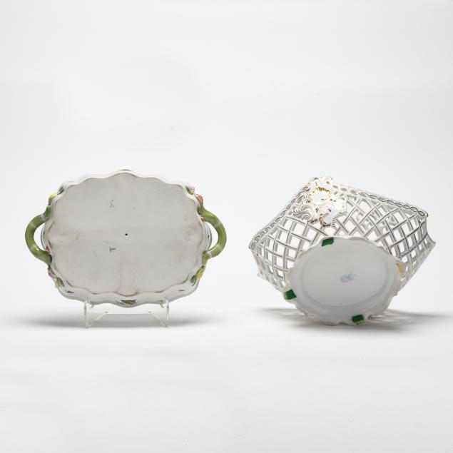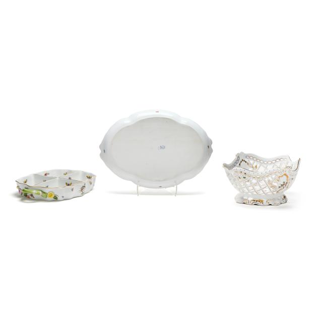Hungary, hand-painted, decorated with birds and insects, to include an oval openwork basket #7437 (12 1/4 in.); an oval ribbon tray #400 (15 3/4 in.); and a four-part handled hors d'oeuvres dish with applied flowers #442 (11 1/2 in.); marked to underside.