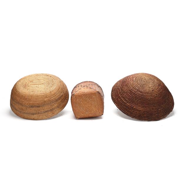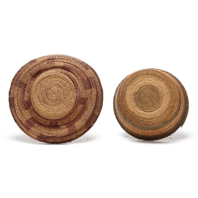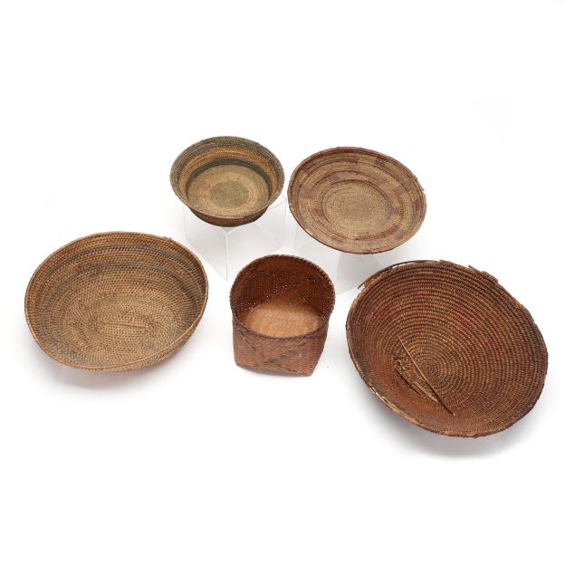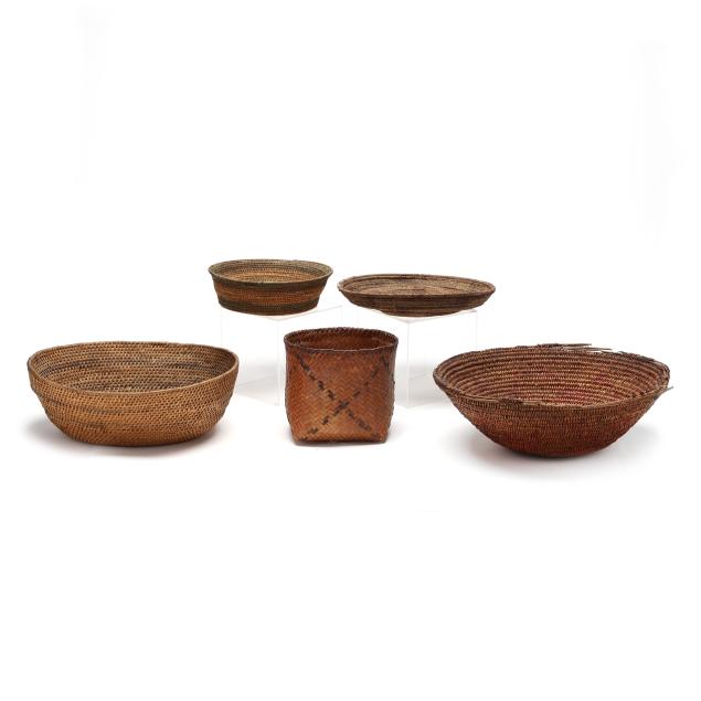 Early to mid-20th century, all unsigned, including four Apache basketry works, likely willow and devil's claw with dyed geometric designs, (3) are in bowl form (15 in. diameter largest), and a single in tray form with red dyed stepped design (11 1/4 in.); also included is a Cherokee rivercane planter basket, with natural dyes round rim over a square base (7 in.).