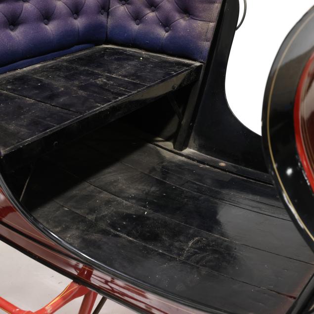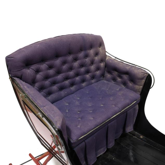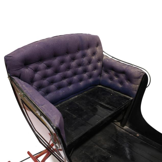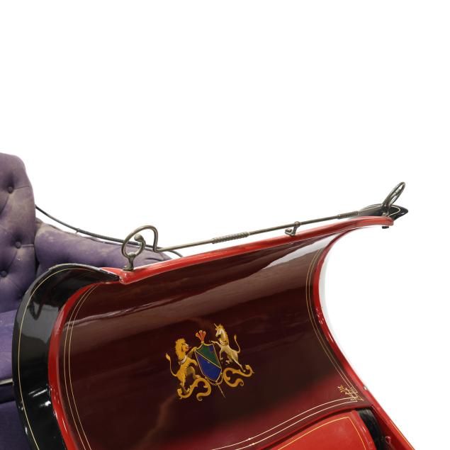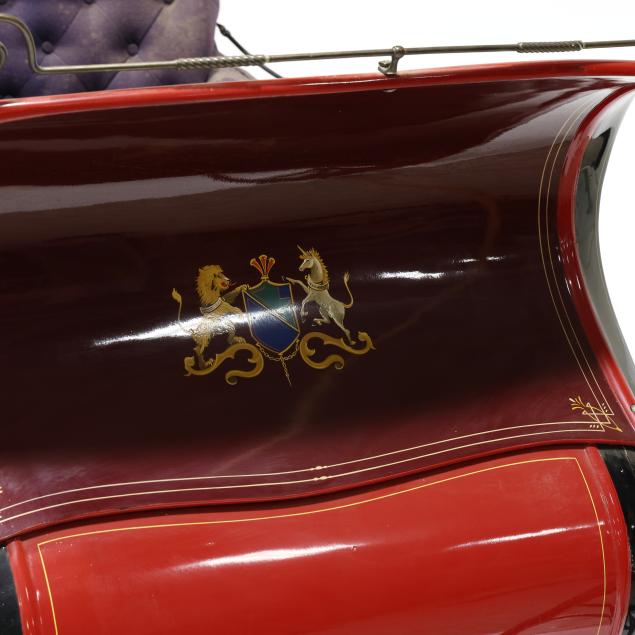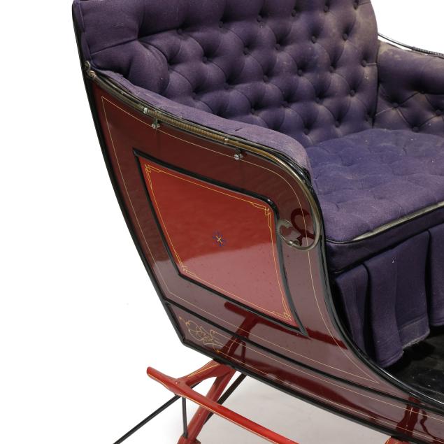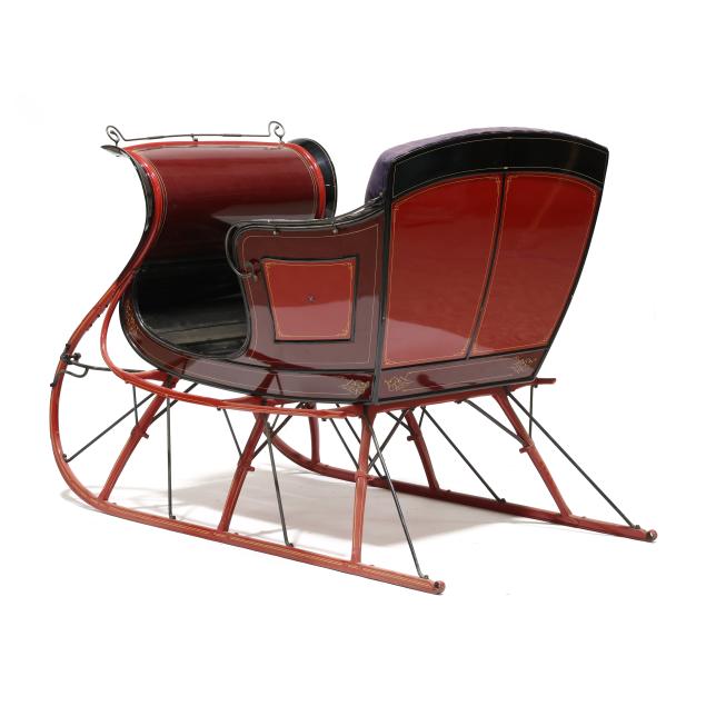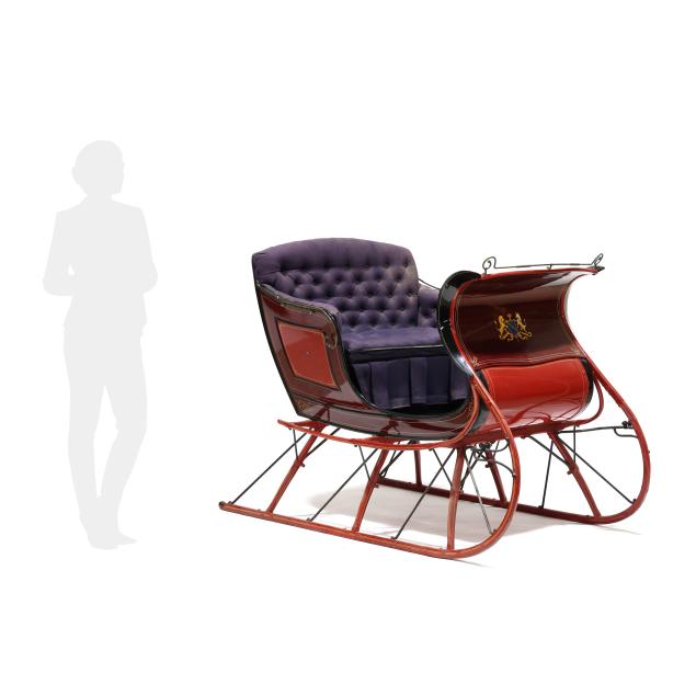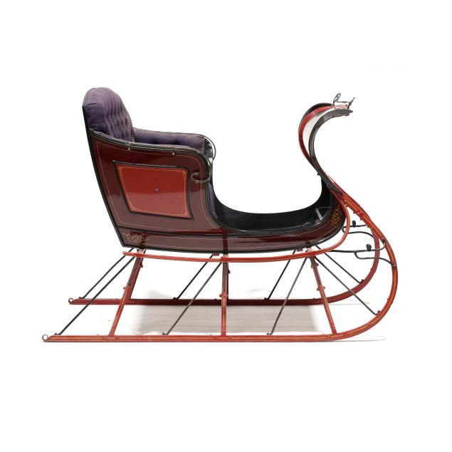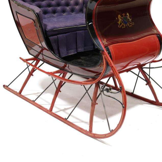 Circa 1900, Portland cutter form, design attributed to Peter Kimball of Maine, painted wood and metal, square bodied with a steam curved dash attached to the upward sweep of the runners, royal blue felt seats, and scrolled brass arm mounts, exterior finished with pin-striping and a coat of arms to the obverse.