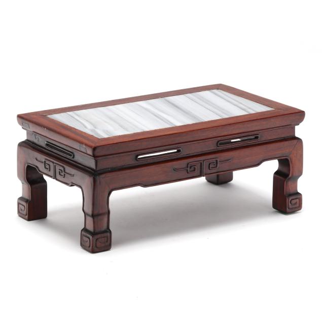 Mid 20th century, a beautiful grained carved rosewood stand with inset marble panel to top, raised on four shaped legs with key motif to feet.