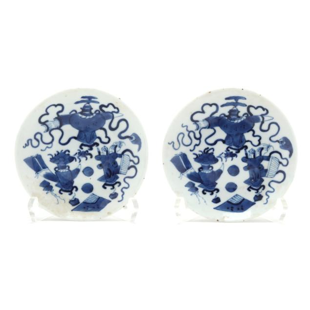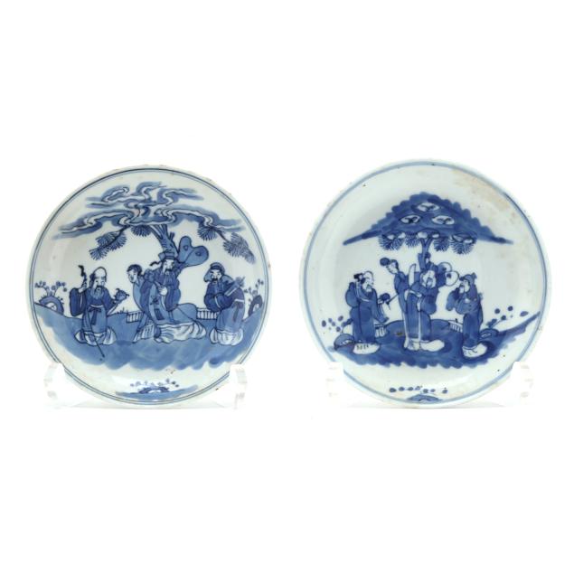 From the Collection of a Gentleman, Fearrington, North Carolina Largest plate with a few hairlines to well, overall crazing; one plate in pair with landscape scene with crack and associated fleabites from rim to well, the other with two small chips to rim; a few of smallest plates with pitting.