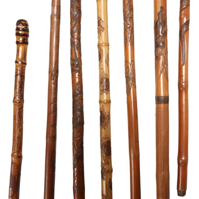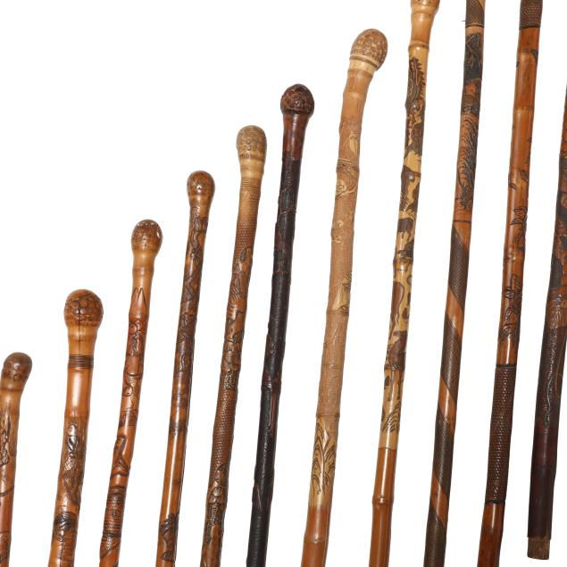 Meiji period (1868-1912), includes seventeen (17) carved bamboo wood gentleman's walking sticks, resembling a branch in shape with slender proportions that are carved with a myriad of different animals, having either a curved handle or knotted ball to top of each.