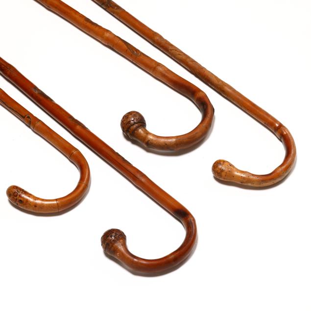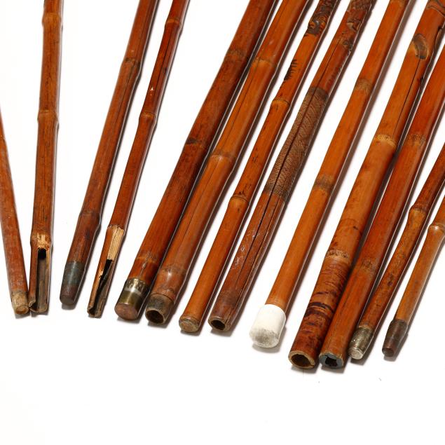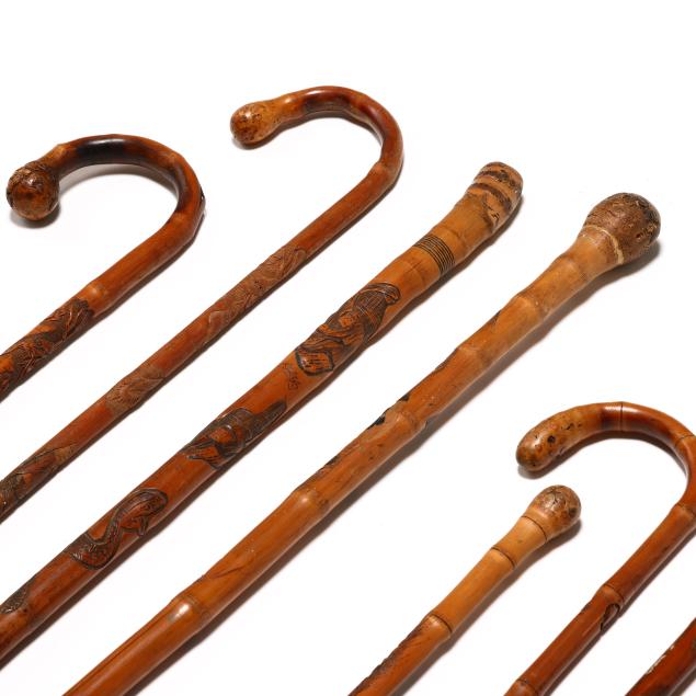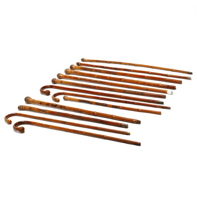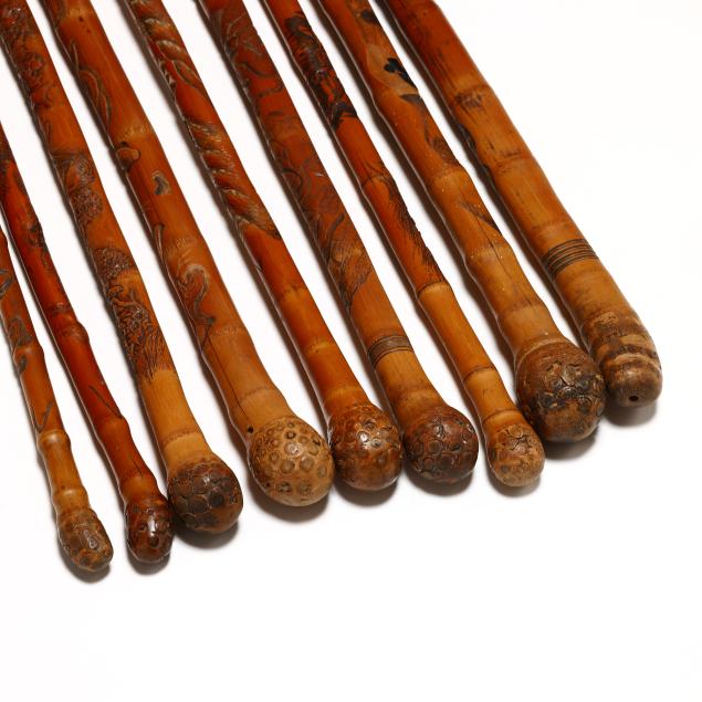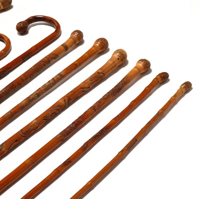 Meiji period (1868-1912), includes thirteen (13) carved bamboo wood gentleman's walking sticks, resembling a branch in shape with slender proportions that are carved with various Japanese motifs and folklore, having either a curved handle or knotted ball to top of each, most have inscriptions to the upper or lower sections.