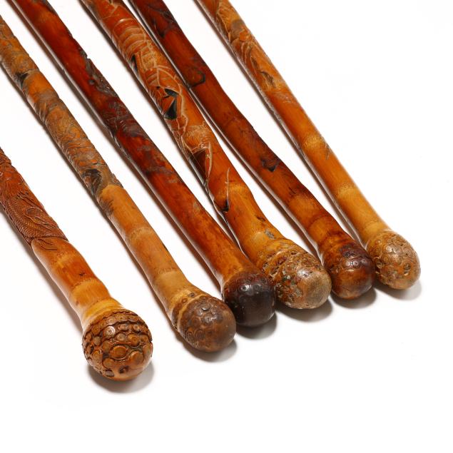 Meiji period (1868-1912), includes eleven (11) carved bamboo wood gentleman's walking sticks, resembling a branch in shape with slender proportions that are carved with various Japanese motifs like Daruma, Hotei, Kabuki mask faces, tigers, and dragons, having either a curved handle or knotted ball to top of each, most have inscriptions to the upper or lower sections.