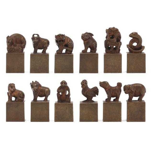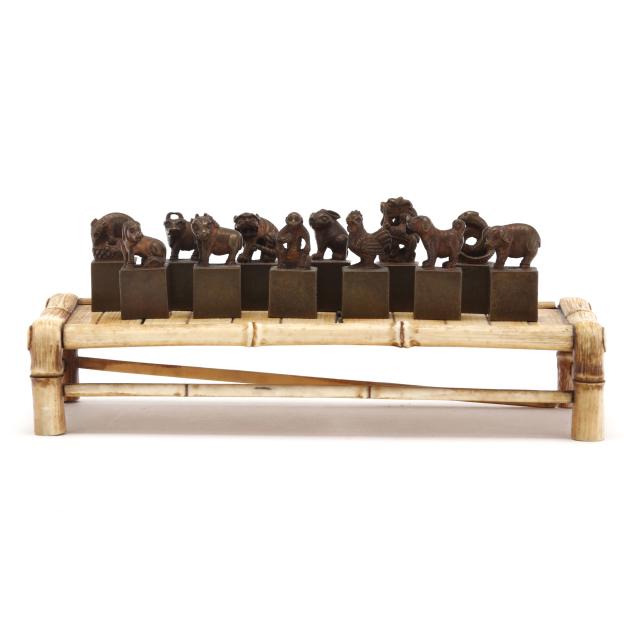 a-set-of-twelve-zodiac-bronze-animals-seals-with-bone-bamboo-tray