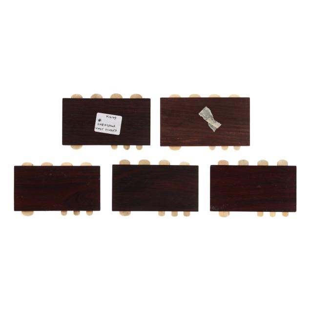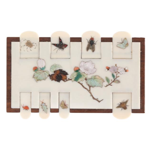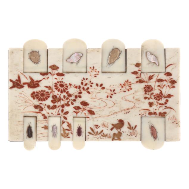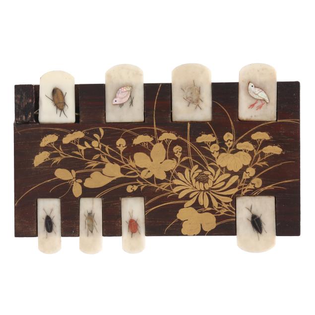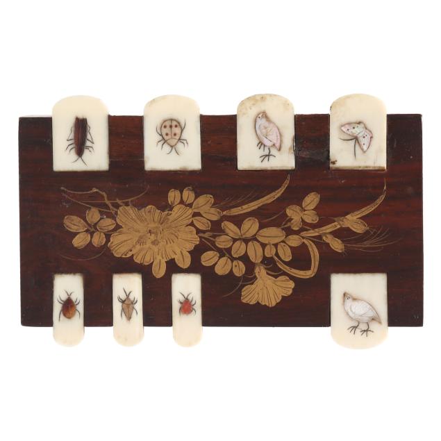 Meiji period (1868-1912), five wooden and ivory whist counters with lacquered gilt and Shibayama style flowers, and small ivory tokens inlaid with insects and birds.