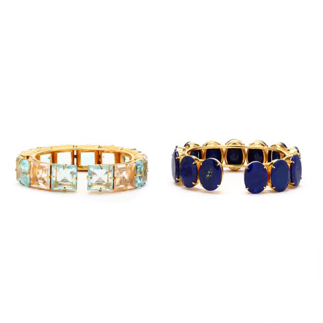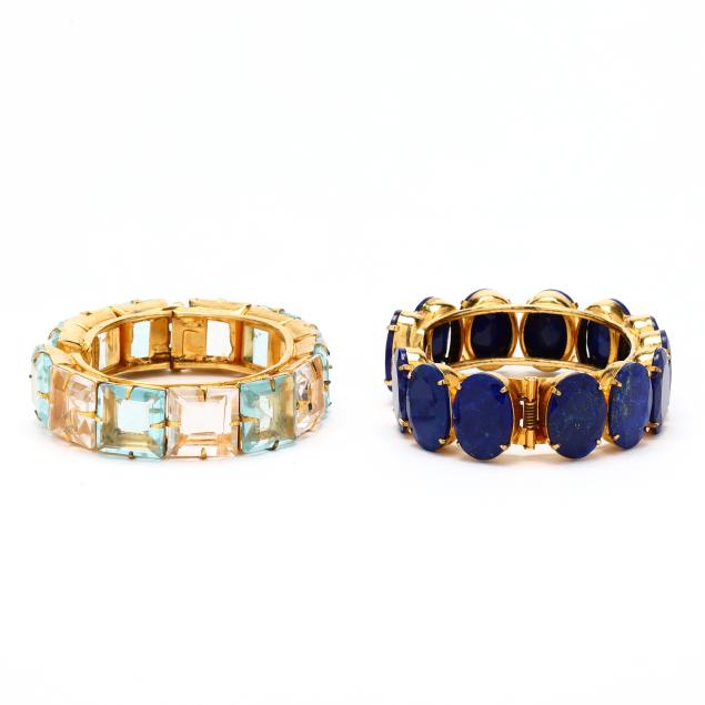 To include: one set with alternating square cut blue glass and rock crystal quartz (14 x 14mm), completed with one hinged end, signed (6 in. with .25 in. opening); and one set with oval cut imitation lapis lazuli (18 x 13mm), completed with one hinged end, signed (5.75 in. with 5/8 in. opening).