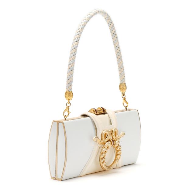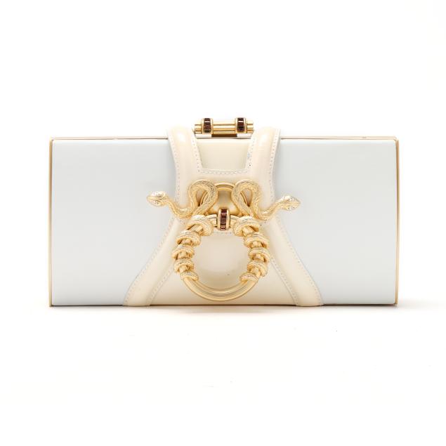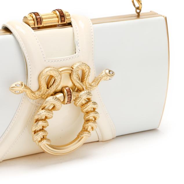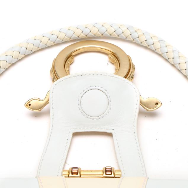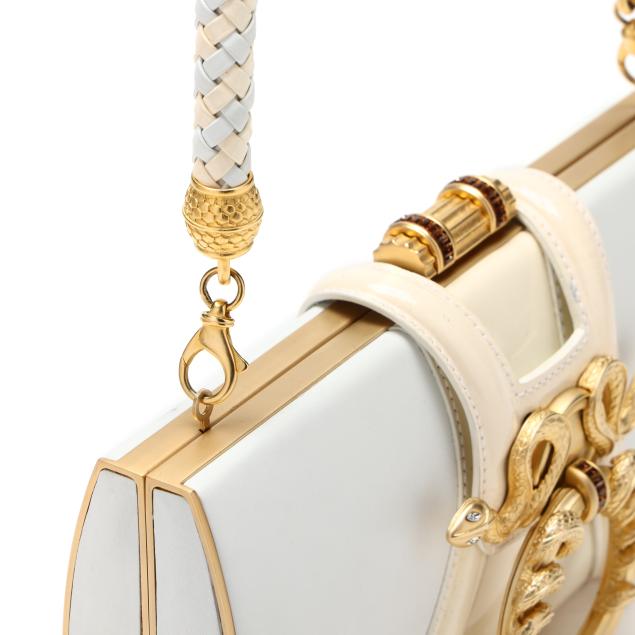 The exterior in white leather and cream patent leather with matte finish gold-tone hardware, braided leather handle, gold-tone magnetic clasp with snake and door knocker motif set with crystals, and gold-tone and crystal push clasp, the interior in pink suede with brand tag, marked made in Italy.