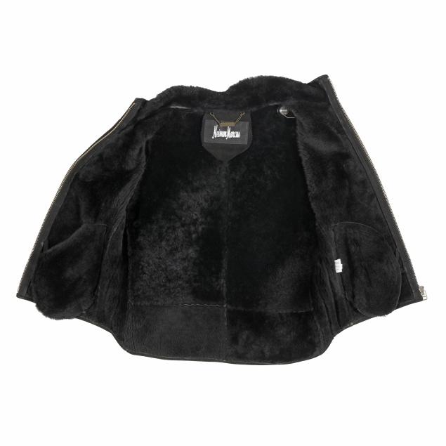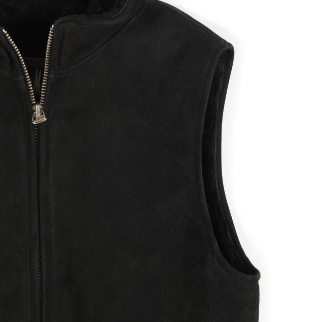 The exterior in black suede with two pockets and zipper, the interior in black lamb fur with tags stating Genuine / Lamb Fur Skin, Made in Korea, XS, and with care tag.