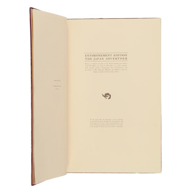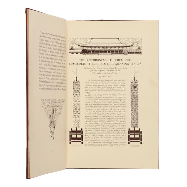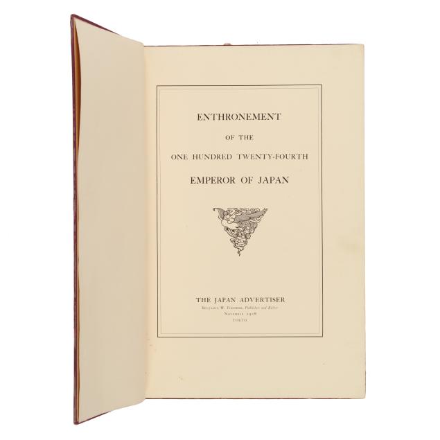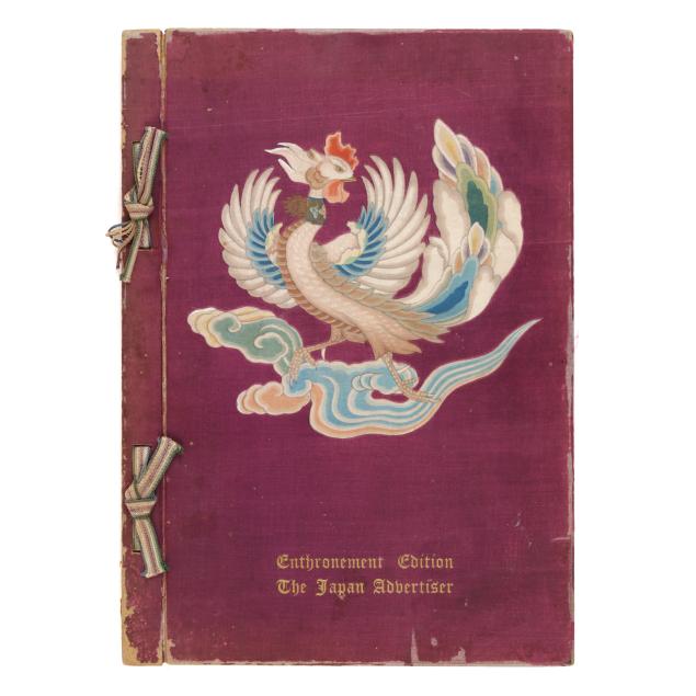 Benjamin W. Fleisher, ed. ENTHRONEMENT OF THE ONE HUNDRED TWENTY-FOURTH EMPEROR OF JAPAN. Tokyo: The Japan Advertiser, 1928. Stated "Enthronement Edition." Pictorial silk-covered boards with multi-colored ribbon ties and gilt-lettering, gilt spine with orange cloth pieces at the ends, and pictorial endpapers. Folio; xvi, 179, [1]pp. With original color woodblock print of Himeji Castle by Hiroshi Yoshida tipped in, frontispieces, and abundant in-text and full-page illustrations.