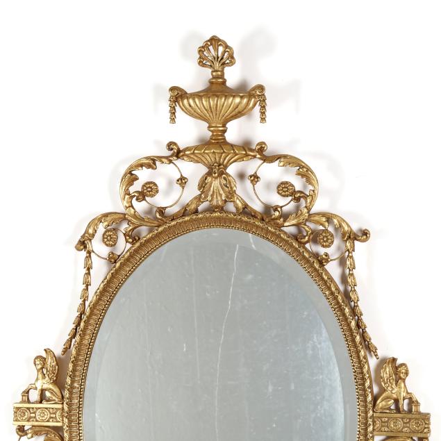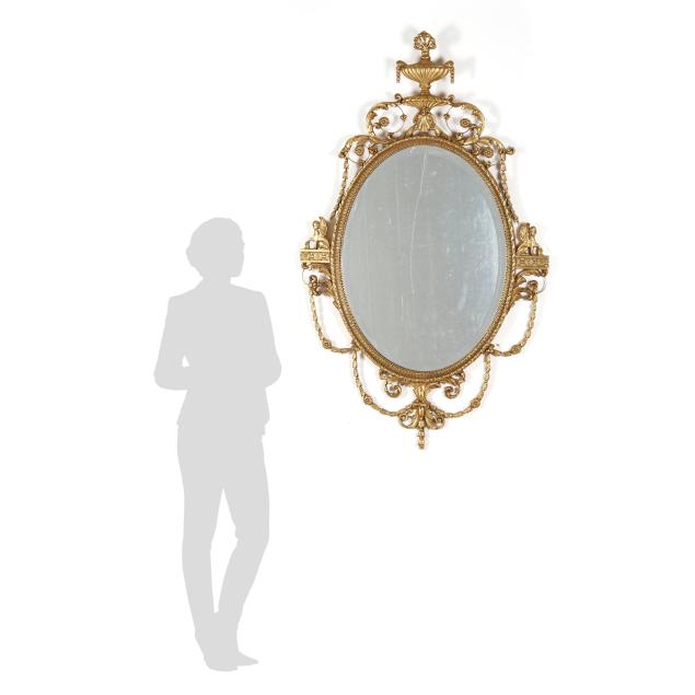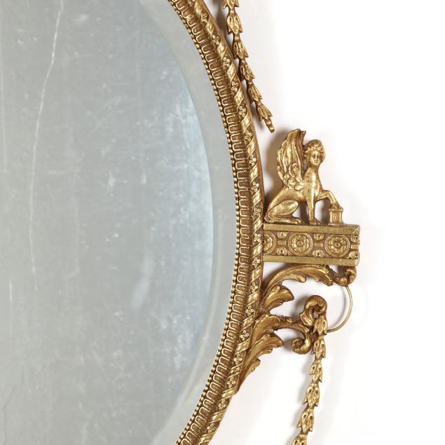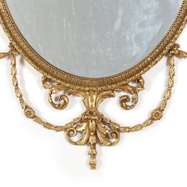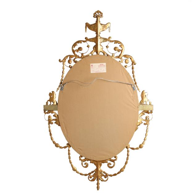 Late 20th century, wood and gesso frame with gilt surface, oval beveled mirror, fluted surround with swag and acanthus leaf decoration, labeled.