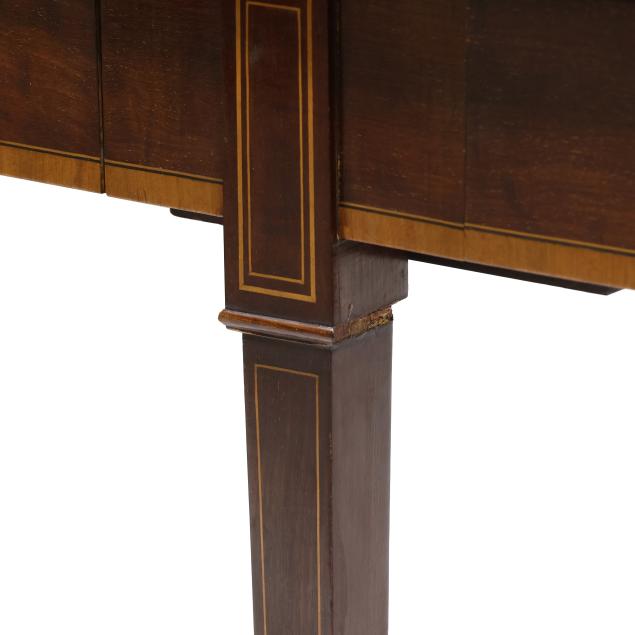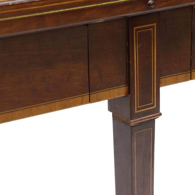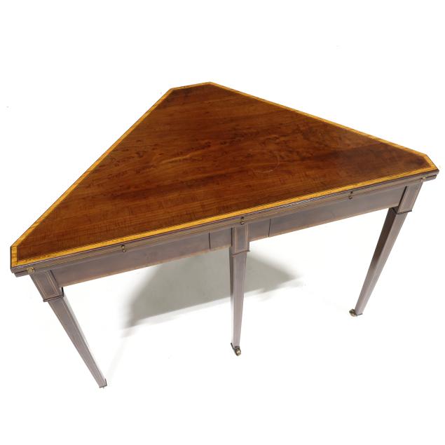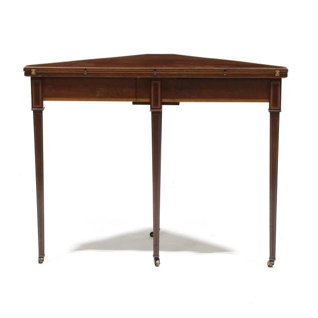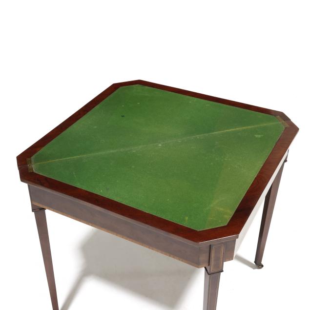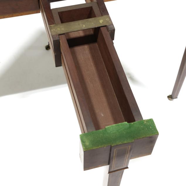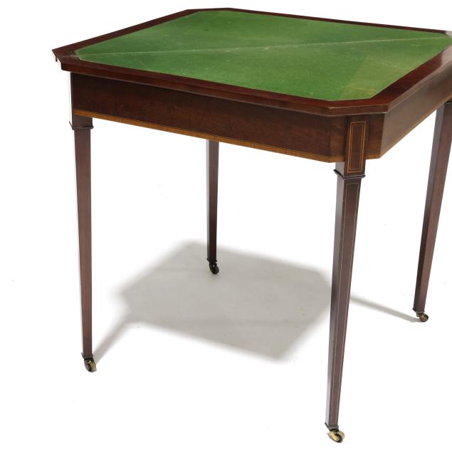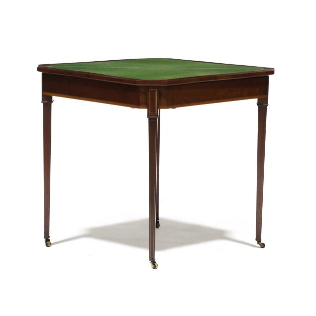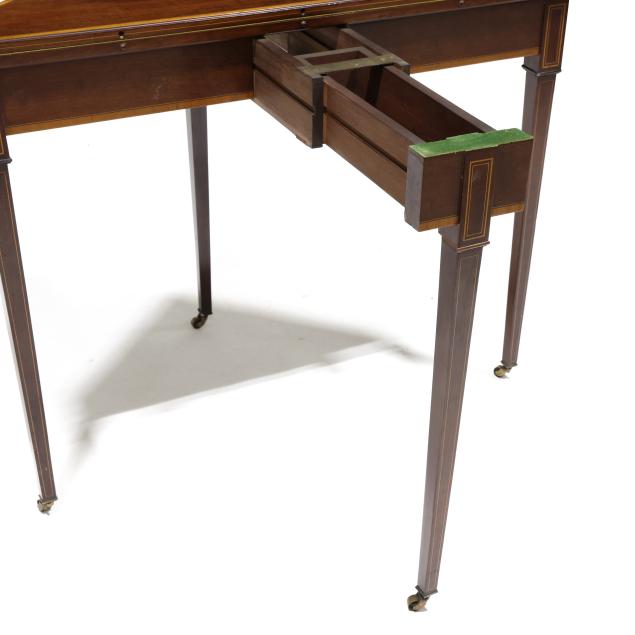 Circa 1900, mahogany veneer, deal secondary, shaped top with banded inlay and molded edge, hinged lid with rear central single slide leg support with storage compartment, green baize playing surface interior, conforming skirt with repeating banded inlay, raised on four straight tapered legs with line inlay, on casters.