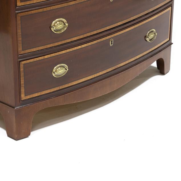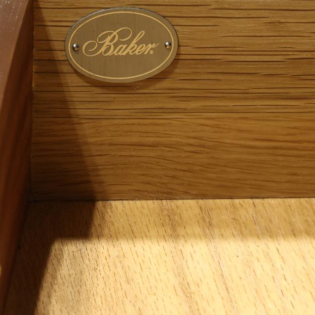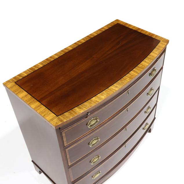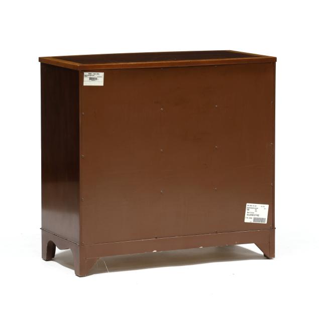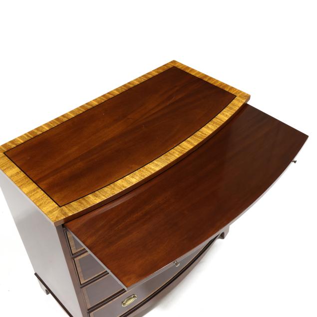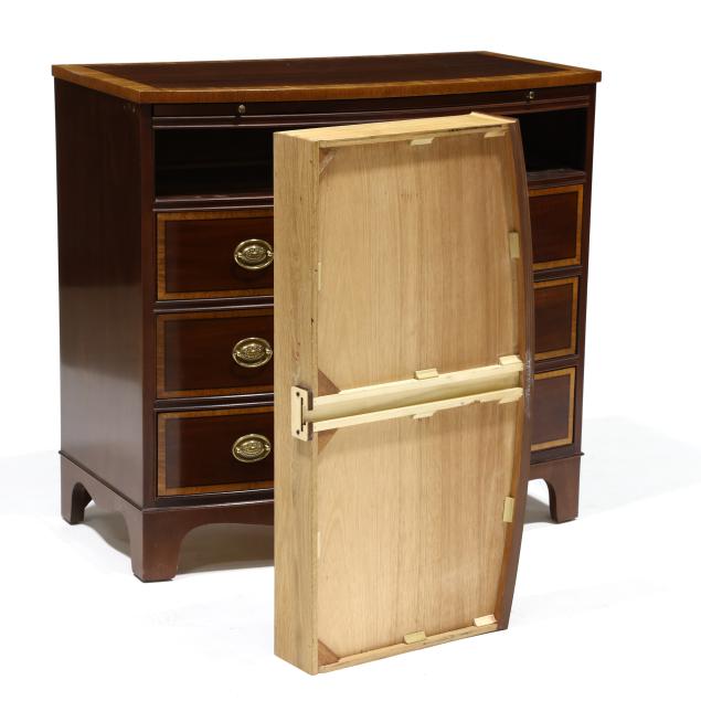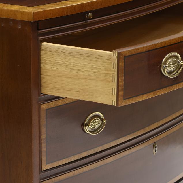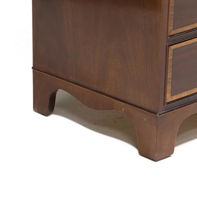 Late 20th century, top with banded inlay, pull out dressing slide, four banded drawers, straight bracket foot base, labeled.